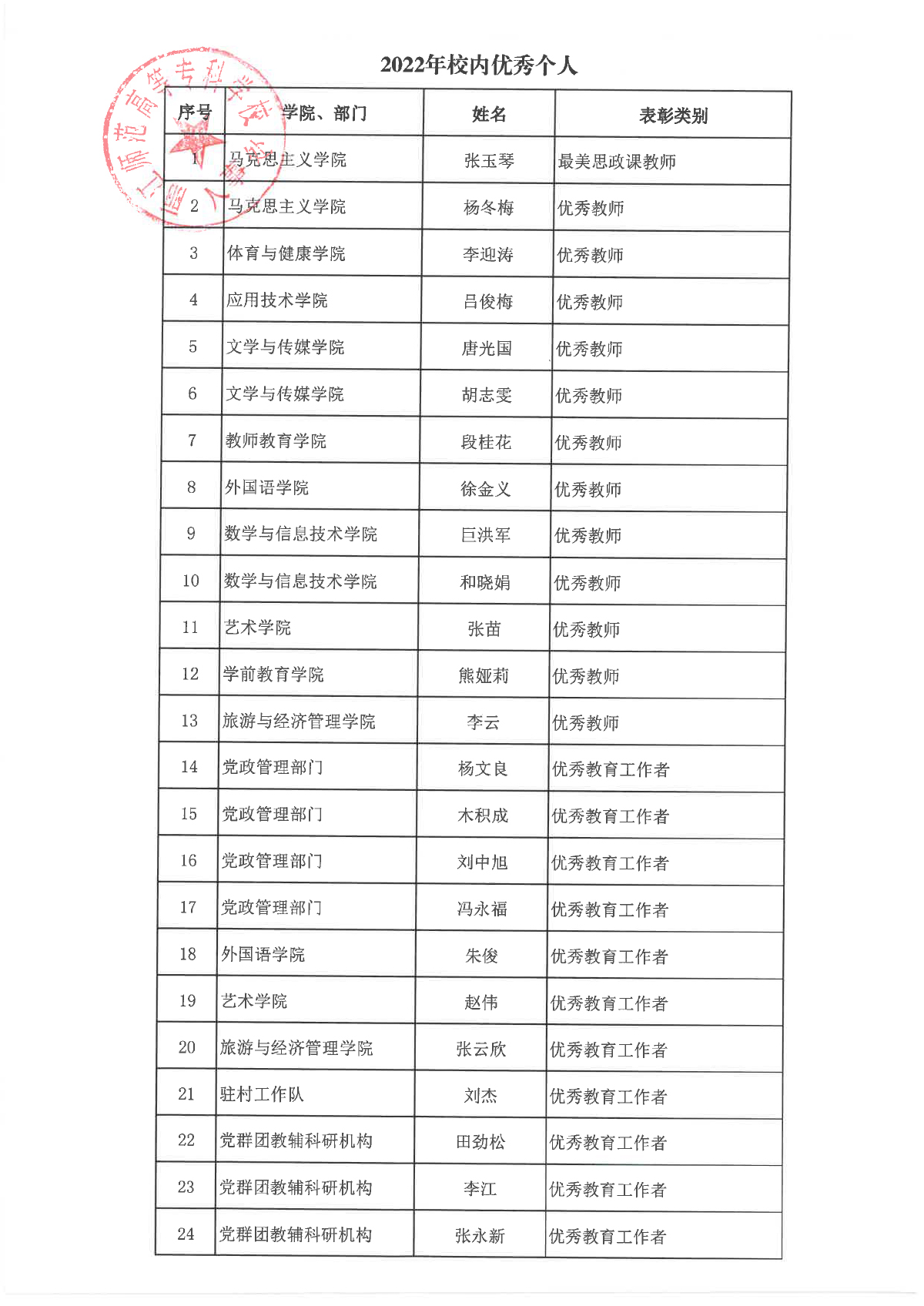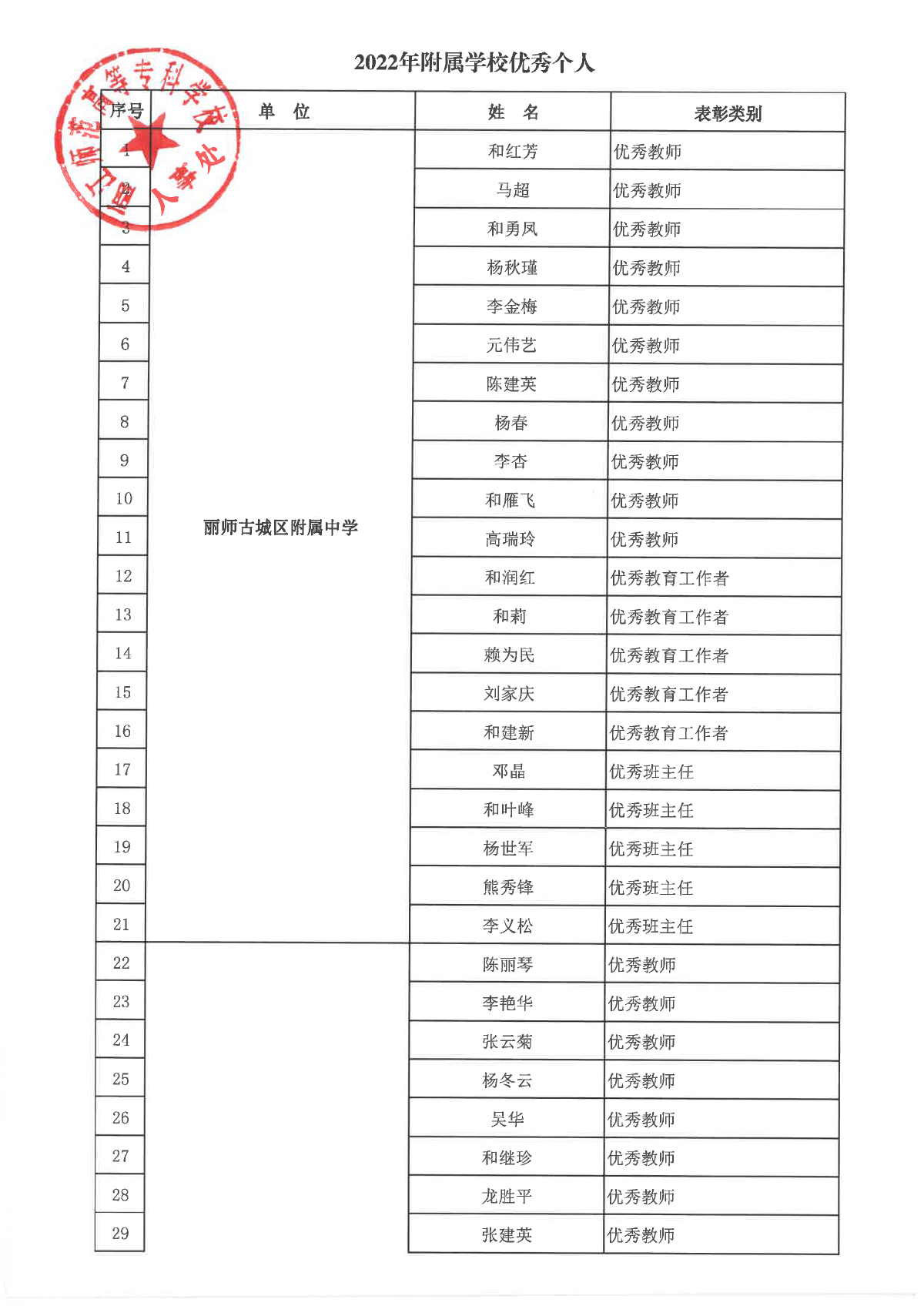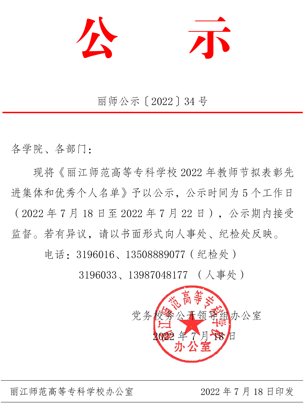 关于丽江师范高等专科学校2022年教师节拟表彰先进集体和优秀个人名单的公示