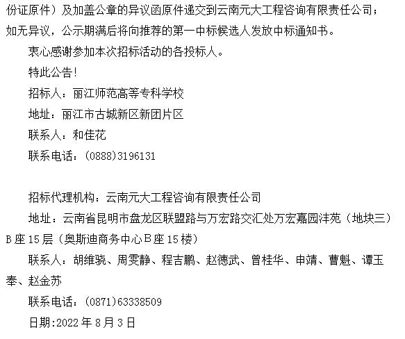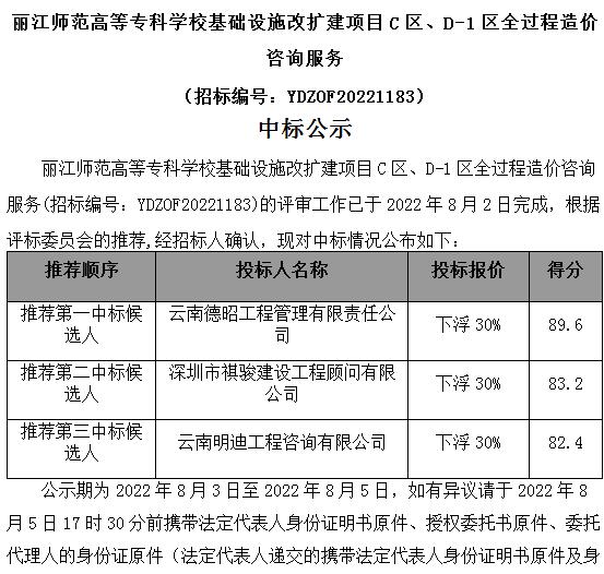 丽江师范高等专科学校基础设施改扩建项目C区、D-1区全过程造价咨询服务 (招标编号:YDZOF20221183) 中标公示