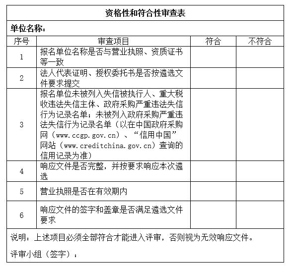 评委根据《资格和符合性审查表》内容逐条对响应文件的资格性和符合性进行评审,审查每份响应文件是否实质上响应了遴选文件的要求,只有全部满足《资格性和符合性审查表》所列各项要求的报名才是有效报名,只要不满足《资格性和符合性审查表》所列各项要求之一的,将被认定为无效报名。