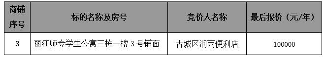 丽江师范高等专科学校2022年学生公寓商铺招租项目(二次)(项目编号:YDZOF20221539)的公开竞价已于2022年2月7日完成,各铺面根据竞价报价最高者得的原则,向出租方推荐1名竞价成交人,因丽江师专学生公寓三栋一楼3号铺面报价第一名放弃成交,随后推荐第二名为竞价成交人,第二名放弃成交,现推荐报价第三名为竞价成交人。经招租人确认,现对成交情况公布如下: