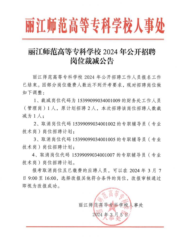 丽江师范高等专科学校2024年公开招聘岗位裁减公告