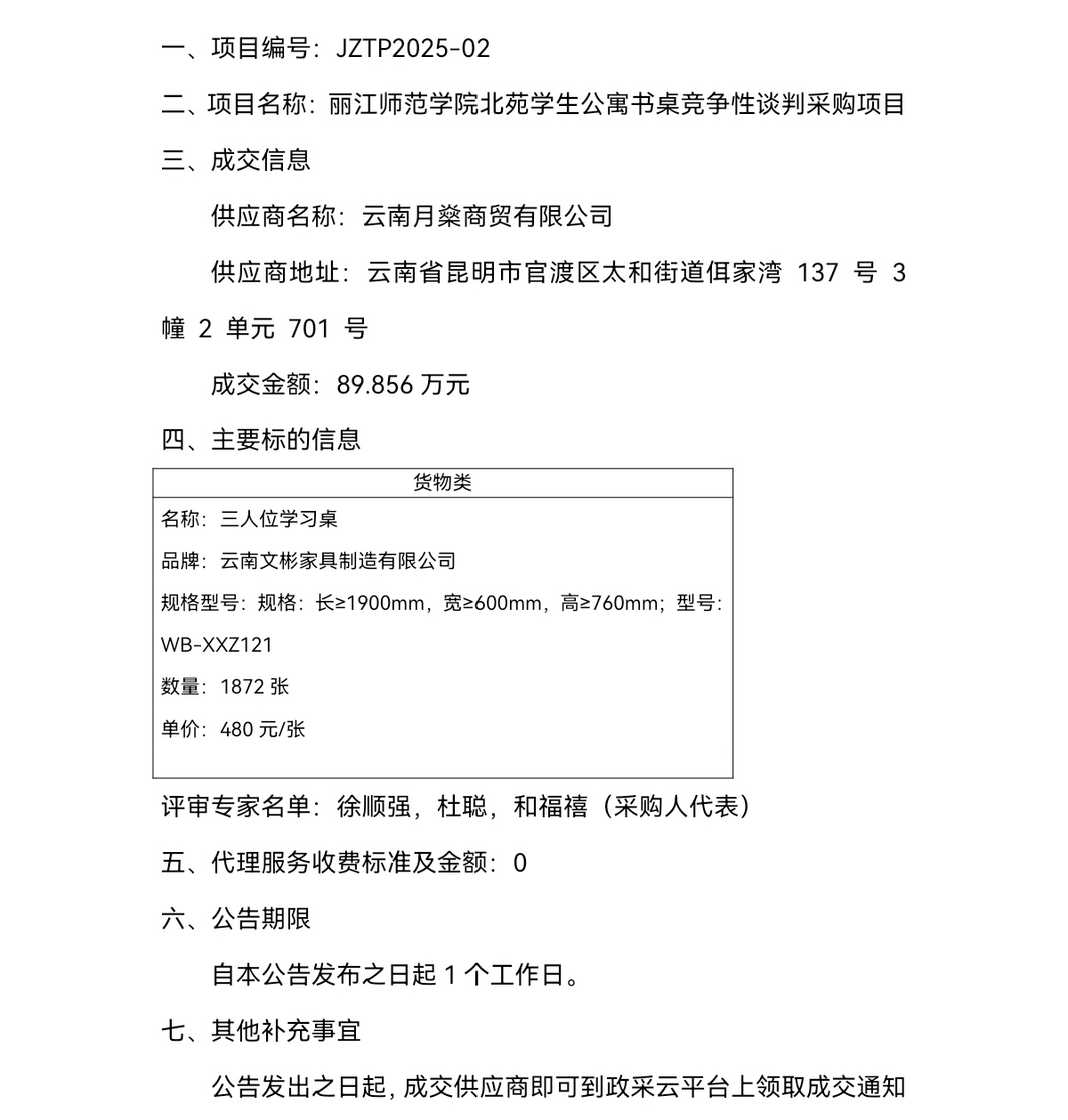 丽江师范学院北苑学生公寓书桌竞争性谈判 采购项目成交结果公告