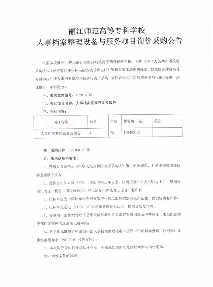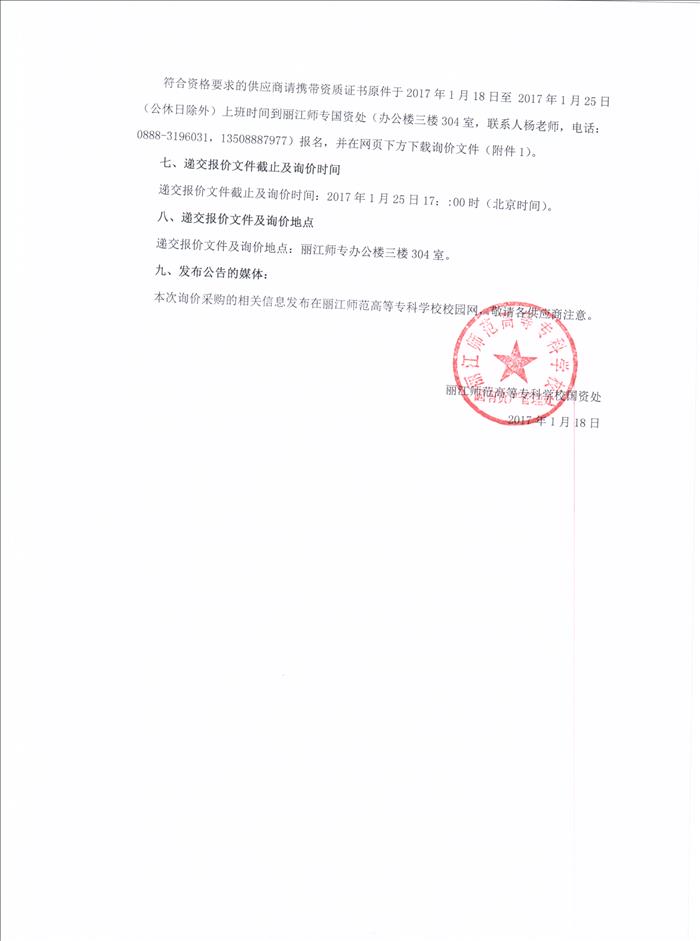 上一条:丽江师范高等专科学校教学楼、学生公寓、食堂修缮工程竞争性谈判公告 下一条:丽江师范高等专科学校“医疗设备及器械、服装服饰”项目——服装服饰询价采购结果公告