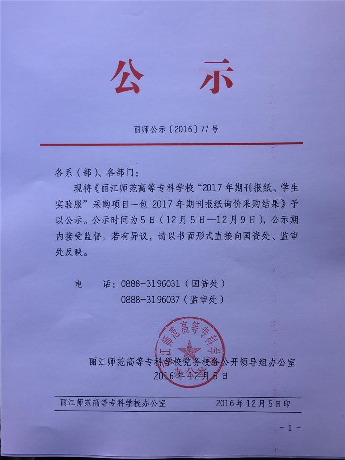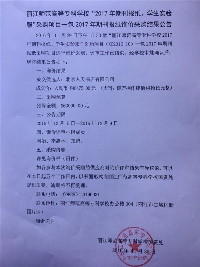 上一条:丽江师范高等专科学校“医疗设备及器械、服装服饰”项目——服装服饰询价采购结果公告 下一条:丽江师范高等专科学校“学生证印制”项目竞争性谈判谈判结果公告