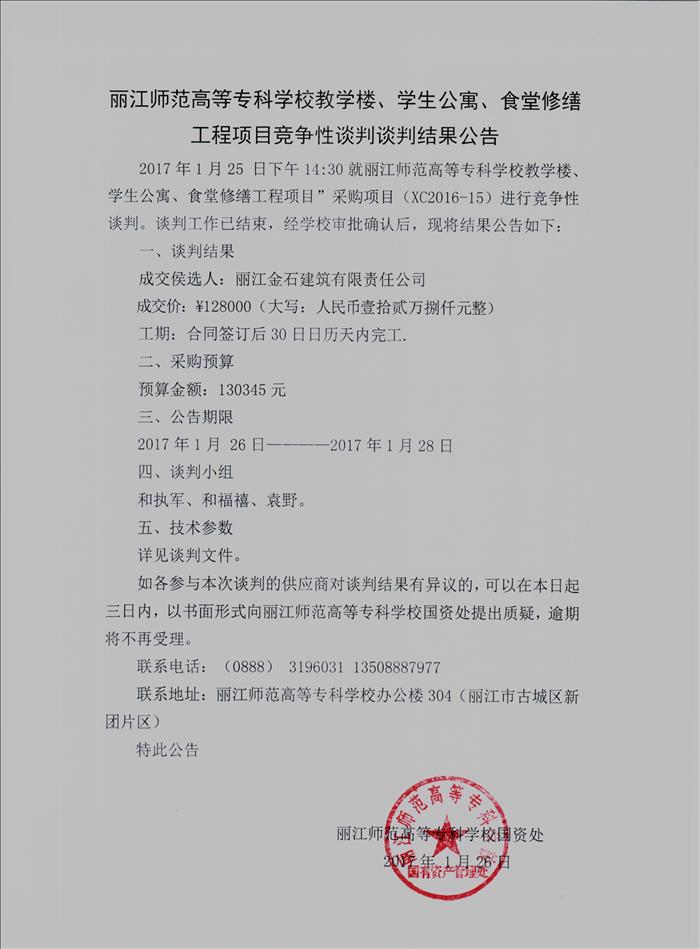 丽江师范高等专科学校教学楼、学生公寓、食堂修缮工程项目竞争性谈判谈判结果公告