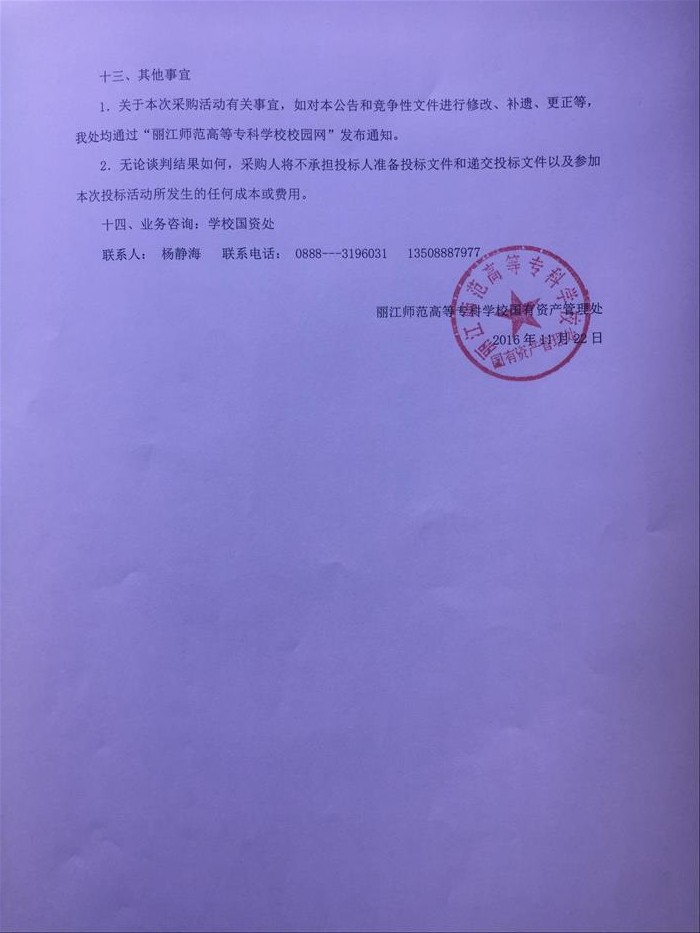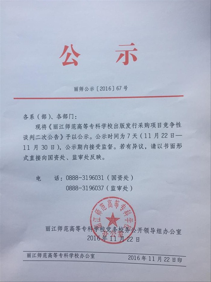 上一条:丽江师范高等专科学校“学生证印制”项目竞争性谈判谈判结果公告 下一条:丽江师范高等专科学校2017年期刊报纸、学生实验服采购项目询价公告
