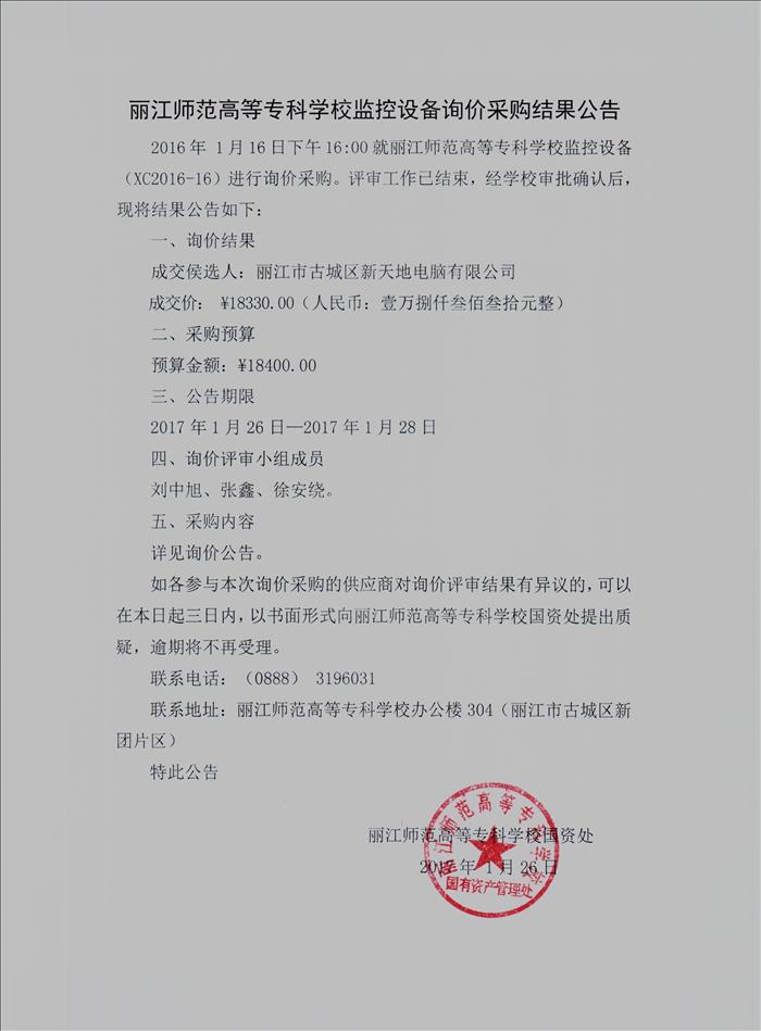 丽江师范高等专科学校公共上网场所安全保护设施设备询价采购结果公告
