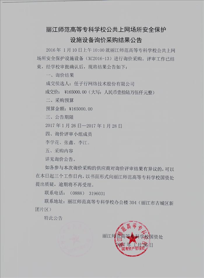 丽江师范高等专科学校公共上网场所安全保护设施设备询价采购结果公告