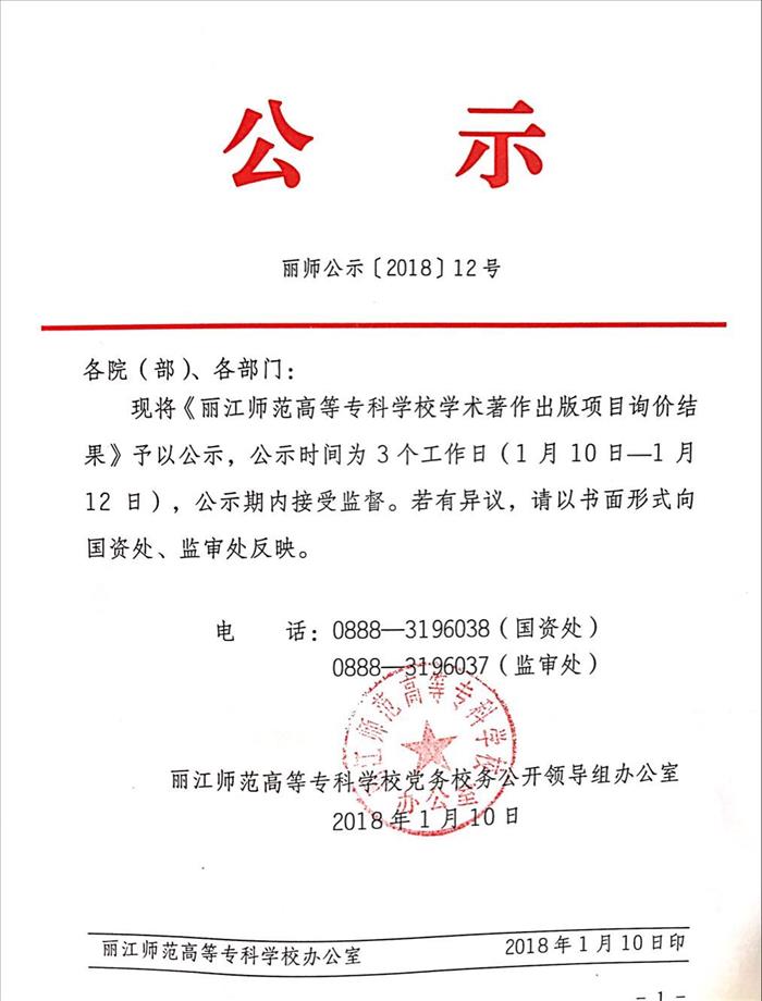 丽江师范高等专科学校学术著作出版项目询价结果公告
