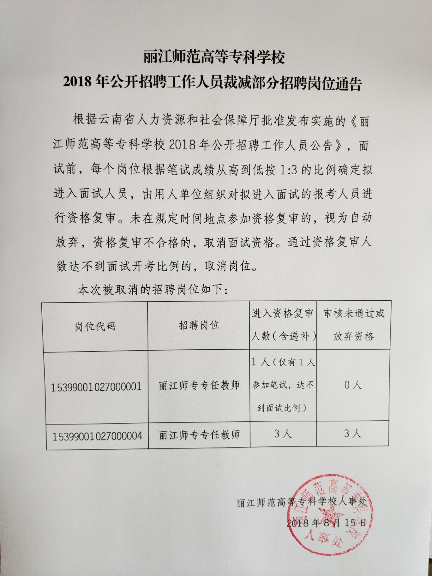 丽江师范高等专科学校2018年公开招聘工作人员裁减部分招聘岗位通告