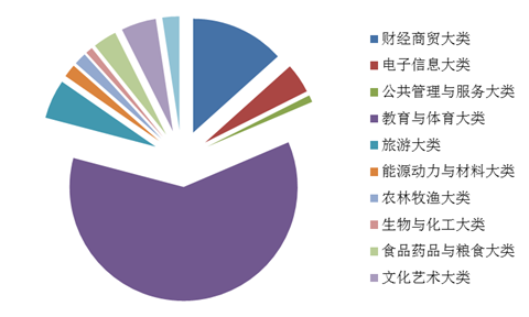 学校设置的专科专业中所属教育与体育大类、财经商贸大类、电子信息大类、公共管理与服务大类、旅游大类、能源动力与材料大类、农林牧渔大类、生物与化工大类、食品药品与粮食大类、文化艺术大类、新闻传播大类等11个专业大类,各专业大类在校学生及其占比分别为3572人(占比60.5%)、787人(占比13.3%)、250人(占比4.2%)、59人(占比1.0%)、328人(占比5.6%)、109人(占比1.8%)、103人(占比1.7%)、59人(占比1.0%)、199人(占比3.4%)、293人(占比5.0%)、142人(占比2.4%)(图表9)。