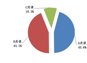 学校重视课程体系的构建,开设918门课程,其中A类课程(理论知识型课程)、B类课程(理论实践型课程)和C类课程(实践型课程)的课程门数占比分别为45.6%、44.1%和10.3%(图表11),有效强化学生专业技能和实践能力的培养。