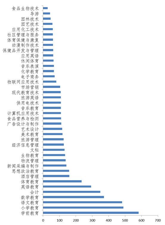 学生人数超过400人的专业分别有学前教育、小学教育和语文教育,学生人数在300人至400人之间的专业有数学教育和会计,学生人数在200人至300人之间的专业有英语教育和体育教育;学生人数在100人至200人之间的专业分别有酒店管理、思想政治教育、新闻采编与制作、物流管理、生物教育、文秘、经济信息管理、旅游管理、美术教育、艺术设计、广告设计与制作、食品营养与检测、计算机应用技术、音乐教育、供用电技术、旅游英语、现代教育技术和市场营销;低于100人的专业分别是物联网应用技术、电子商务、化学教育、音乐表演、休闲体育、应用英语、保健品开发与管理、动漫制作技术、体育保健与康复、社区管理与服务、应用化工技术、园艺技术、园林技术、导游、食品生物技术等专业(图表10),多数专业为近两年开设的新专业或重新恢复招生的专业或已被取消招生资格的专业。