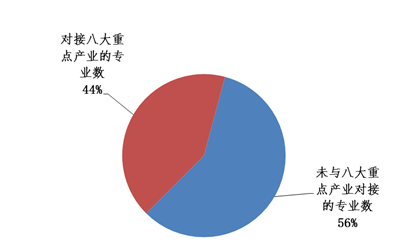 学校设置专科专业43个,对接第一产业的专业有2个,对接第二产业的专业有8个,对接第三产业的专业有33个(图表7)。在学校设置的专业中与云南省八大重点产业相对接的专业有19个,占专业总数的44%(图表8)。