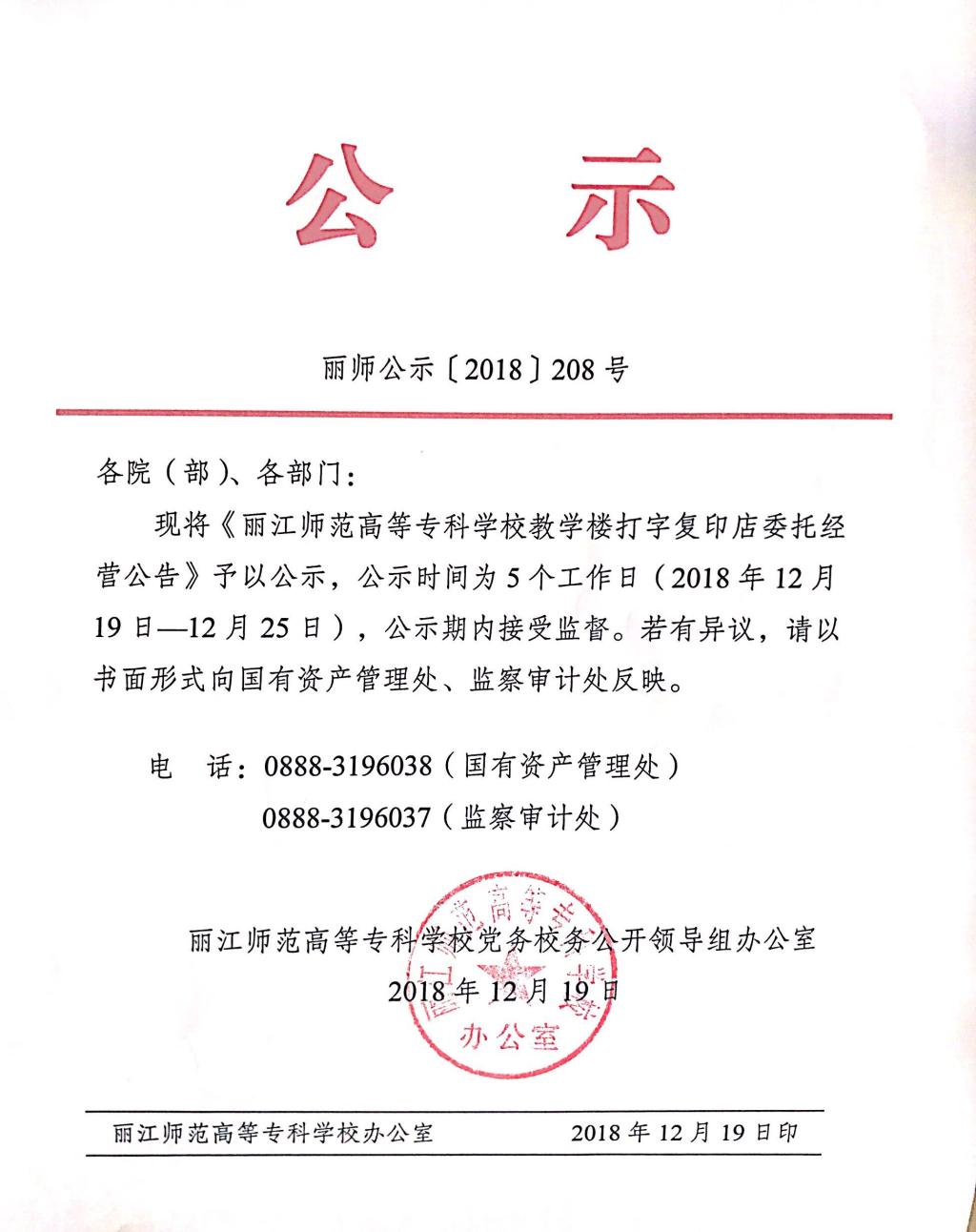 2018年丽江师范高等专科学校教学楼打字复印店委托经营公告
