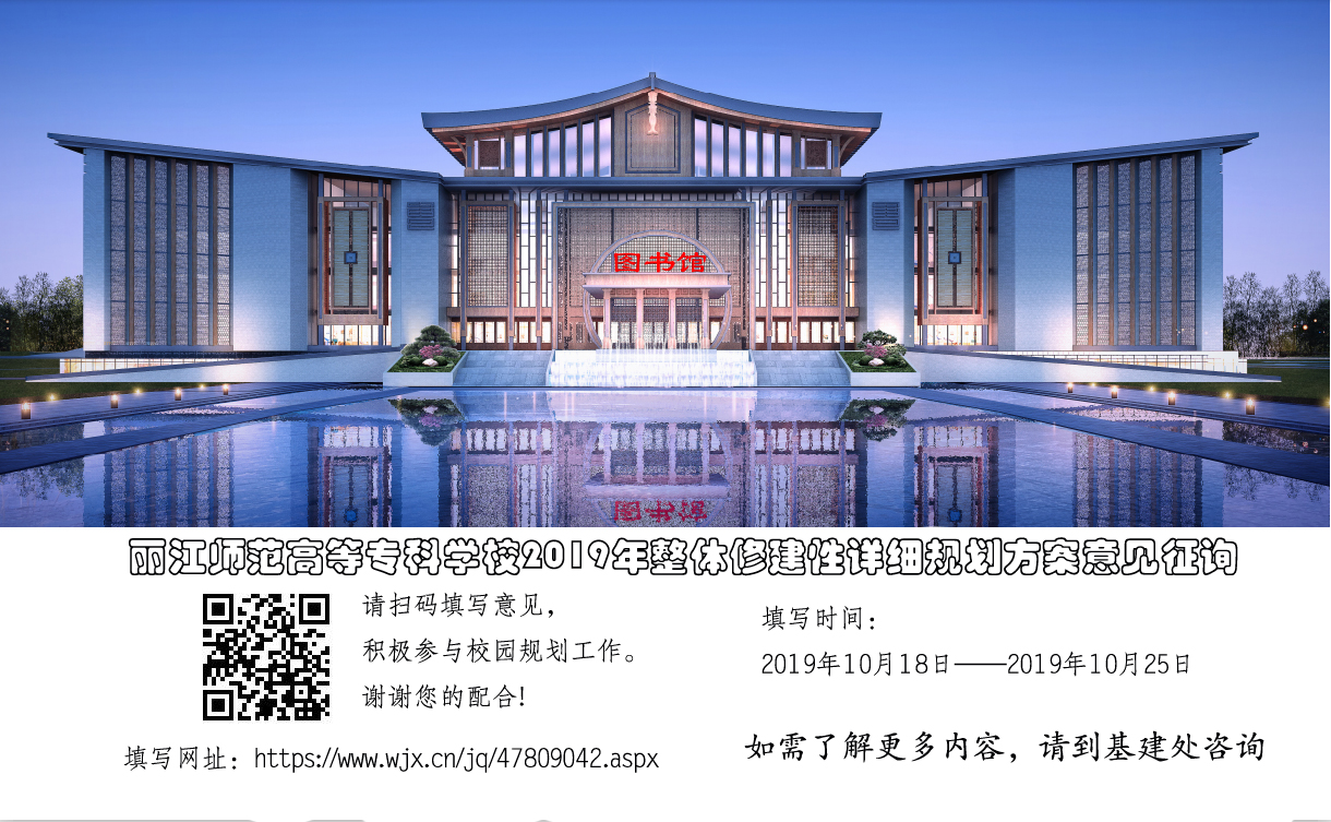 2019年10月,丽江师专完成了《丽江师范高等专科学校2019年学校整体修建性详细规划及建筑单体方案项目(方案讨论稿)》,现把项目公布,面向全校师生及校友征求意见,征求意见方式见上图。项目具体情况如下: