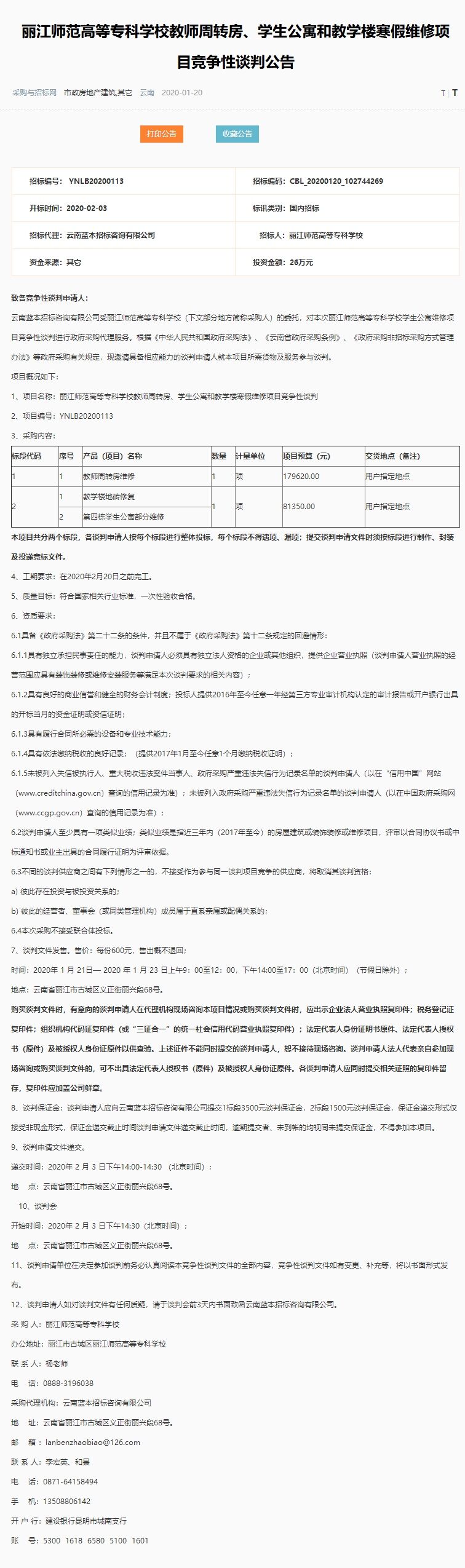 丽江师范高等专科学校教师周转房、学生公寓和教学楼寒假维修项目竞争性谈判公告