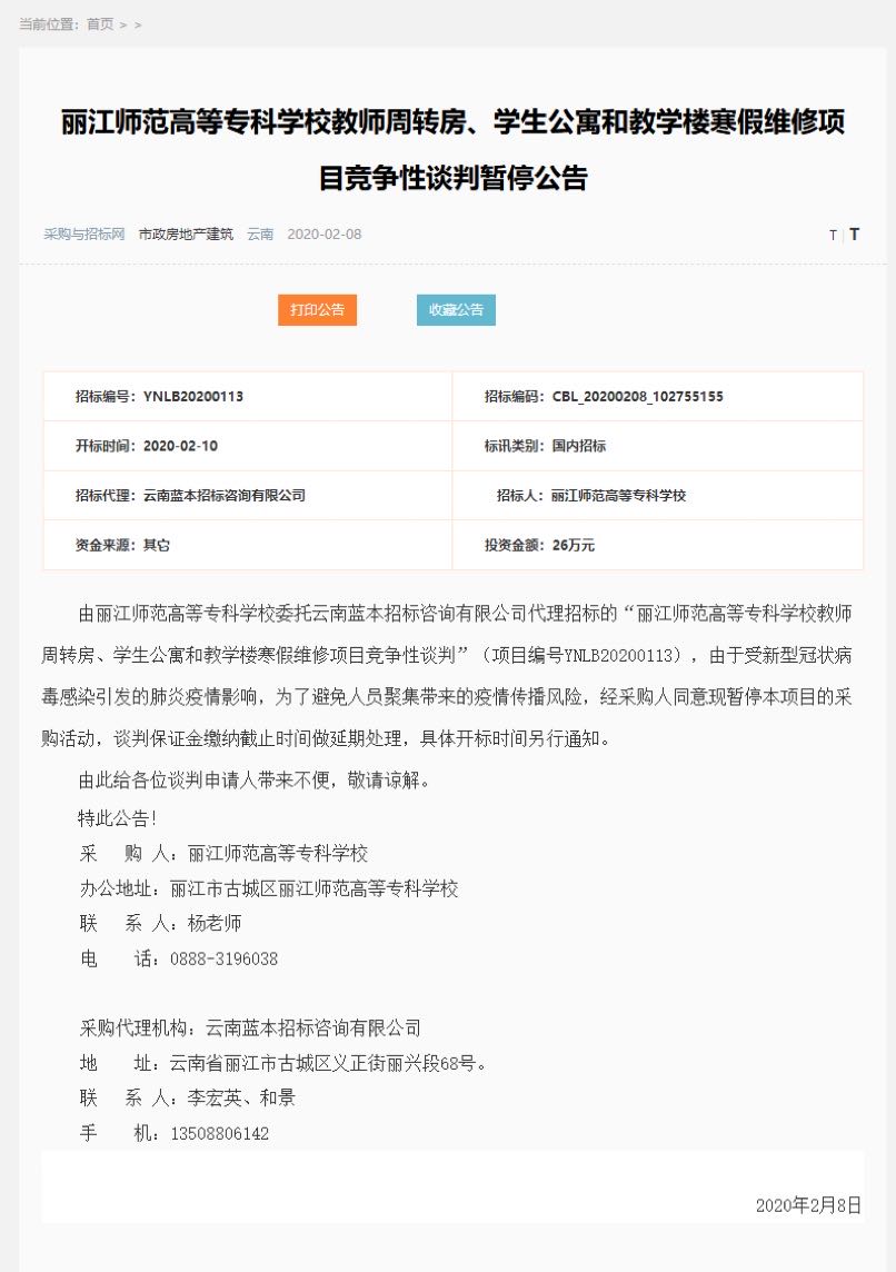 丽江师范高等专科学校教师周转房、学生公寓和教学楼寒假维修项目竞争性谈判暂停公告