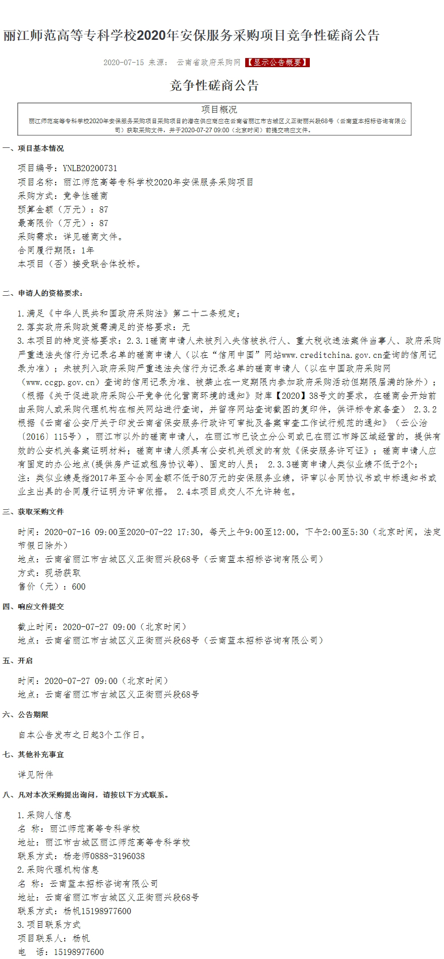丽江师范高等专科学校2020年安保服务采购项目竞争性磋商公告