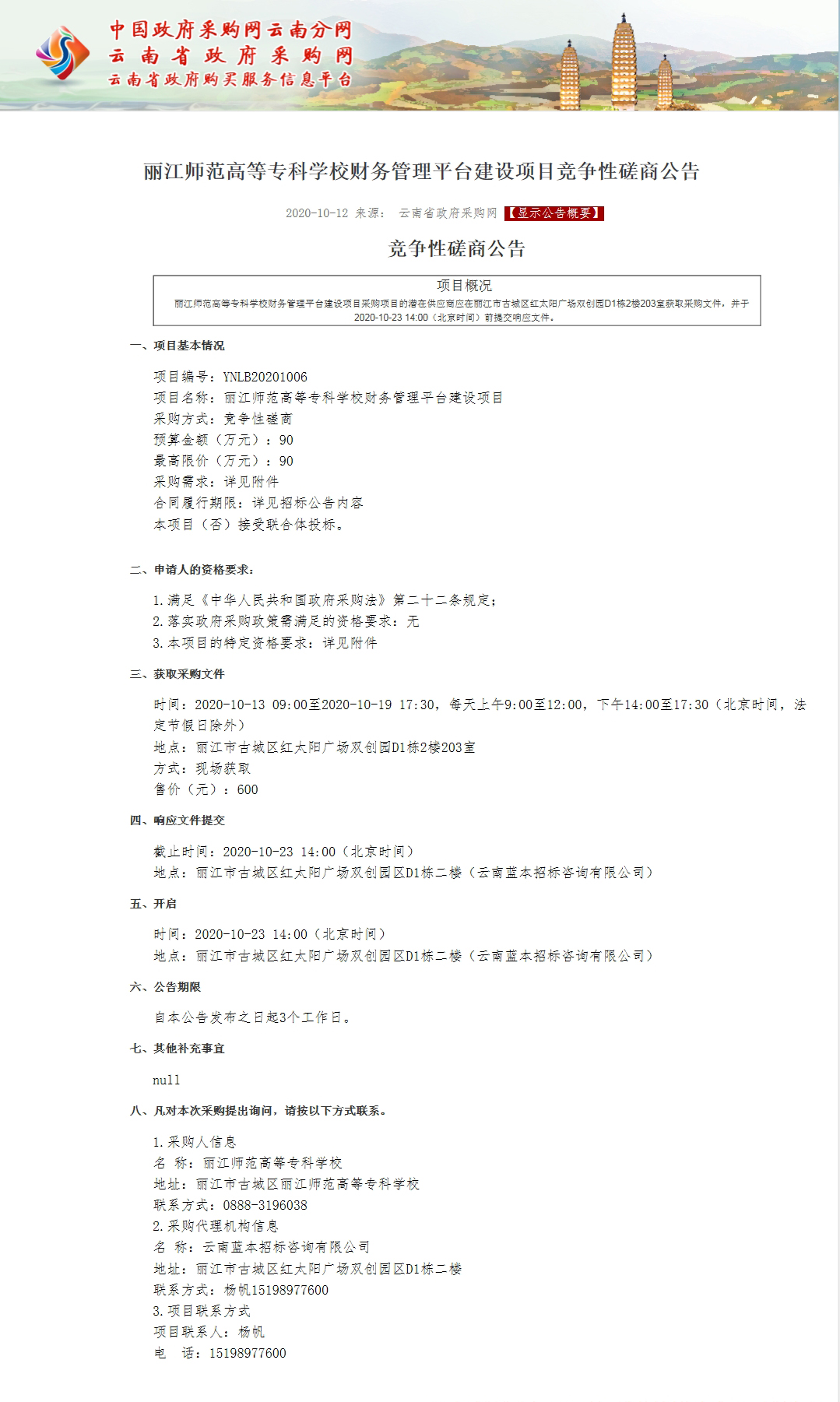 丽江师范高等专科学校财务管理平台建设项目竞争性磋商公告