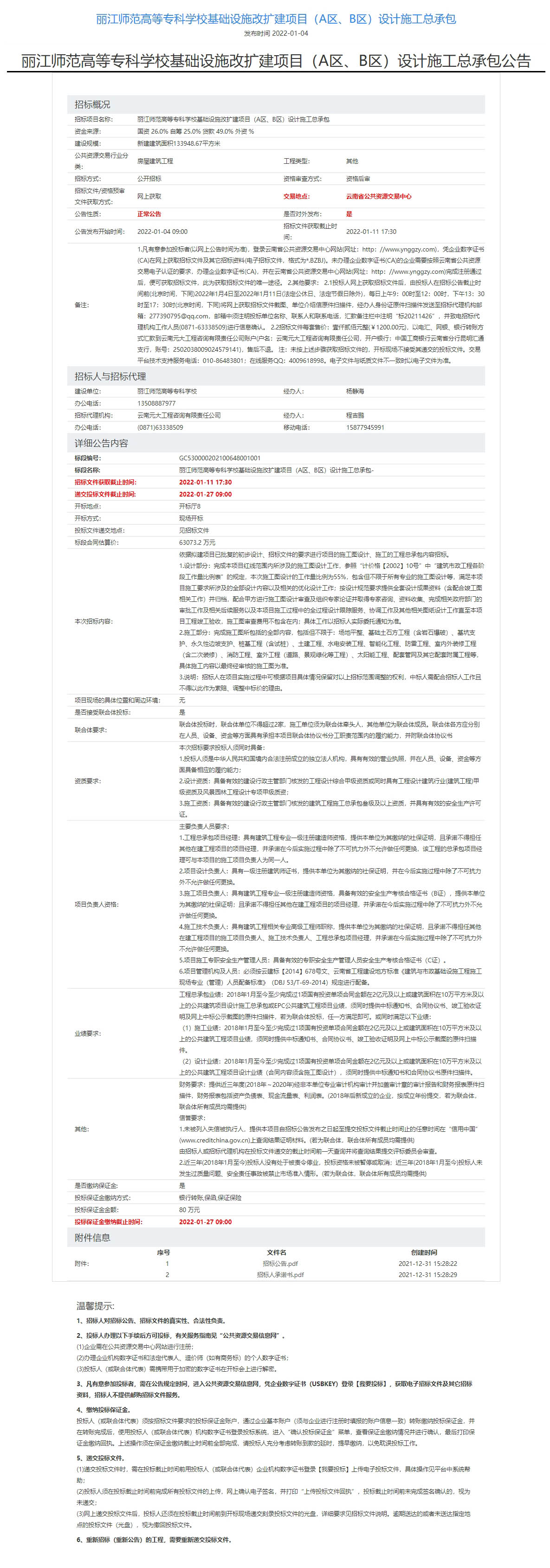 丽江师范高等专科学校基础设施改扩建项目(A区、B区)设计施工总承包
