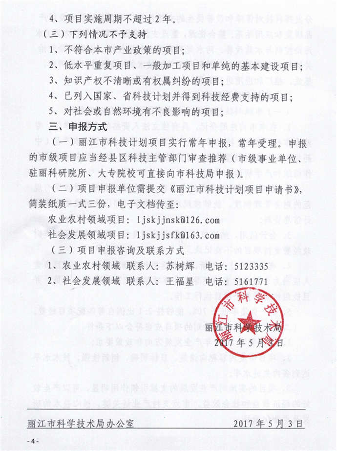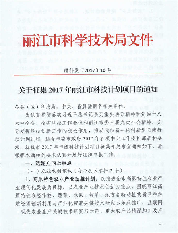 一、项目申报类别、选题重点和申报要求请认真查阅《丽江市科学技术局关于征集2017年丽江市科技计划项目的通知》(以下简称《通知》)。