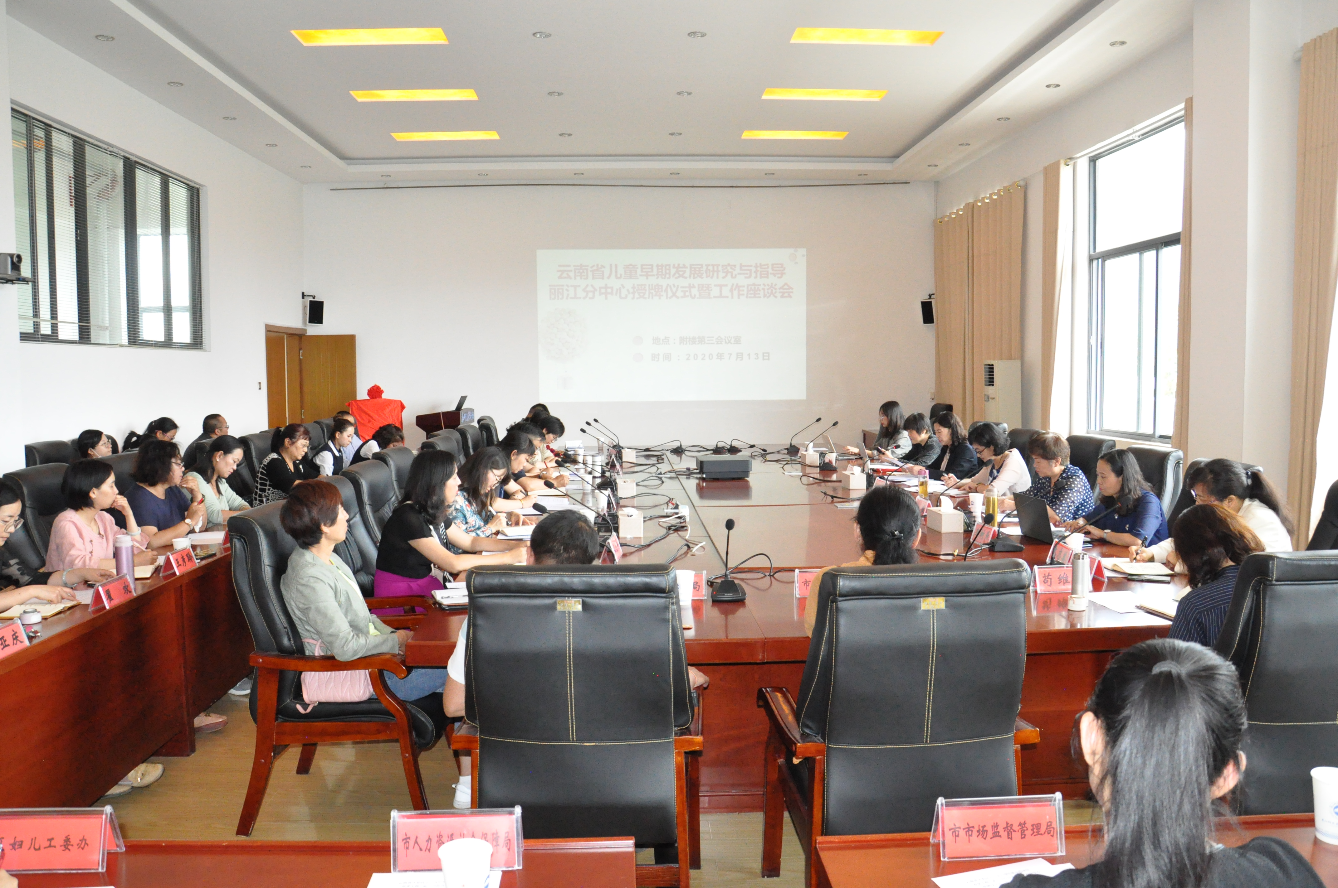 本次授牌仪式由丽江师范高等专科学校党委委员、副校长朱桂香主持,出席授牌仪式暨工作座谈会的领导还有云南省妇儿工委办副主任陈玥,昆明学院学前与特殊教育学院李树燕博士、张昊昱老师,丽江市妇联副主席苟维桂,丽江市教体局、丽江市民政局、丽江市人力资源和社会保障局、丽江市卫生健康局、丽江市市场监督管理局、丽江市总工会、古城区妇儿工委办、玉龙县妇儿工委办的领导,丽江市丽瑛幼儿园、含若含蜜幼儿园、希贝尔·清溪幼儿园、特蕾新丽江幼儿园、蒙台梭利儿童之家等园长和教师代表以及丽江师范高等专科学校学前教育学院的专业教师团队。