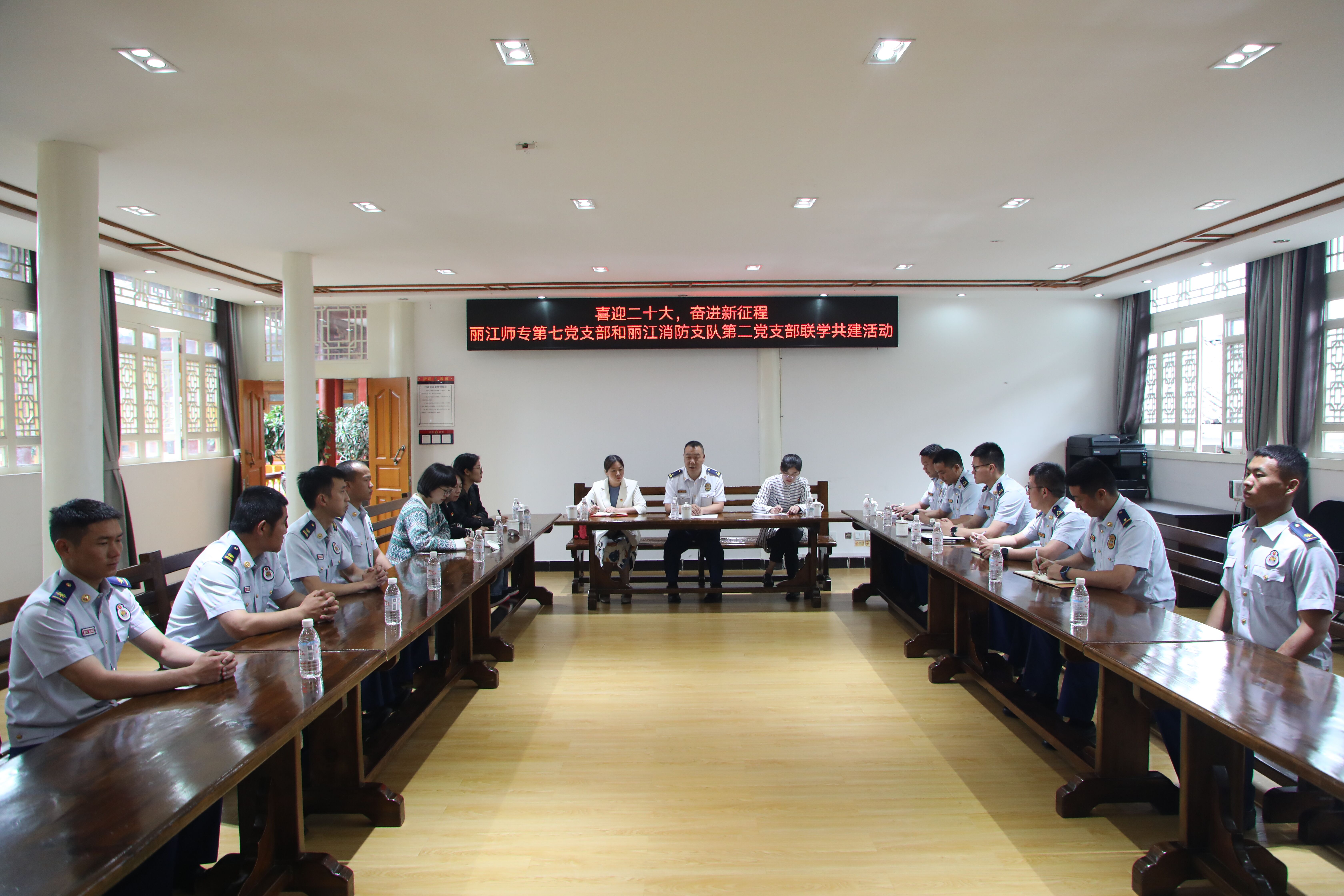 为庆祝中国共产党成立101周年,回顾党的光辉历程,讴歌党的丰功伟绩,进一步激发基层党组织活力,增强党员的责任感、使命感、荣誉感,中共丽江师范高等专科学校机关党总支第七党支部与丽江市消防救援支队第二党支部共同开展主题为“喜迎二十大 奋进新征程”联学共建活动。6月30日下午,丽师机关党总支第七党支部支部副书记李根艳、宣传统战委员杨阳、组织委员杨婷、普通党员代表李艳婷、提交入党申请书代表杨娜一起到丽江市消防救援支队古城消防救援站开展联学共建活动。