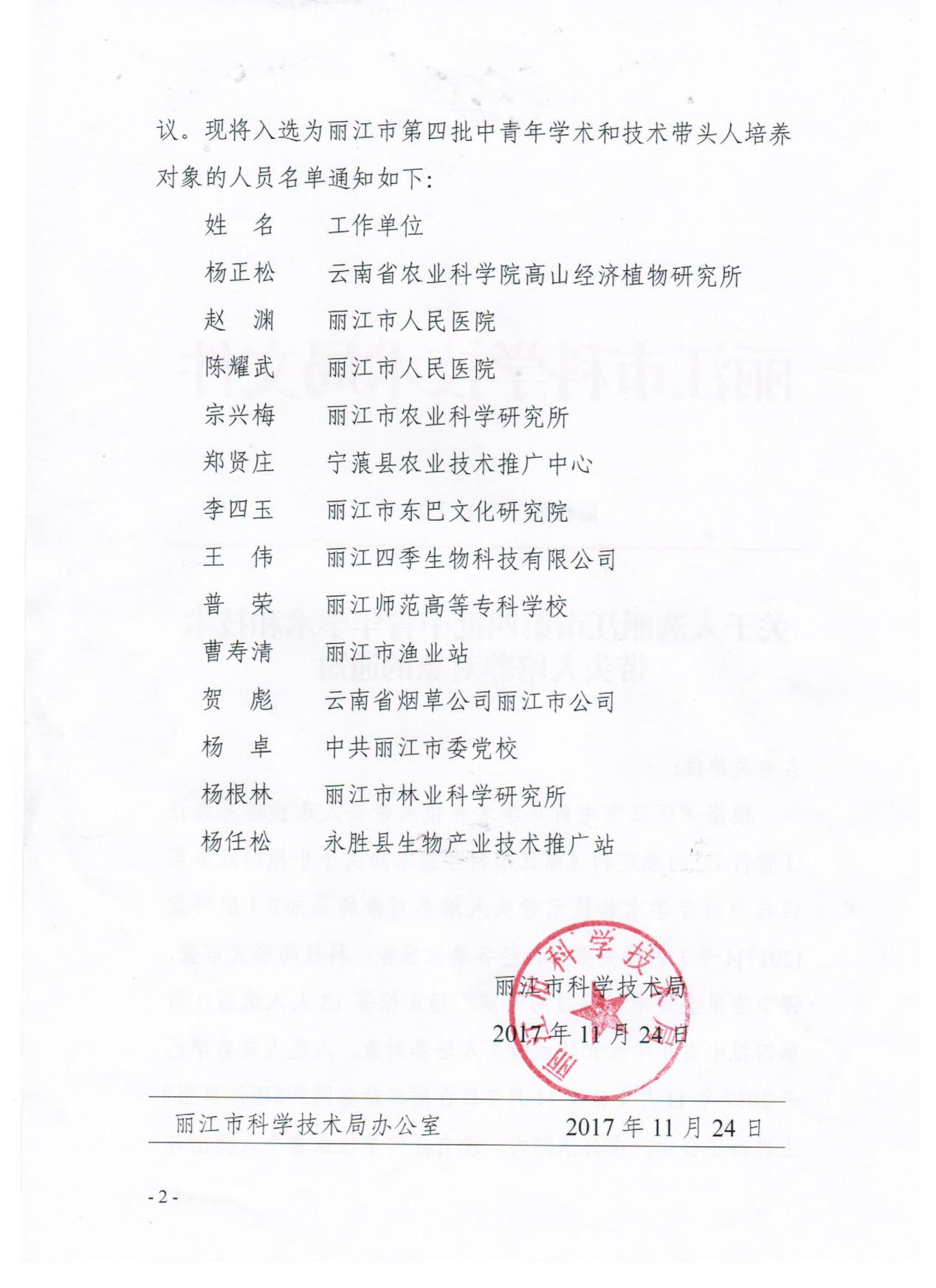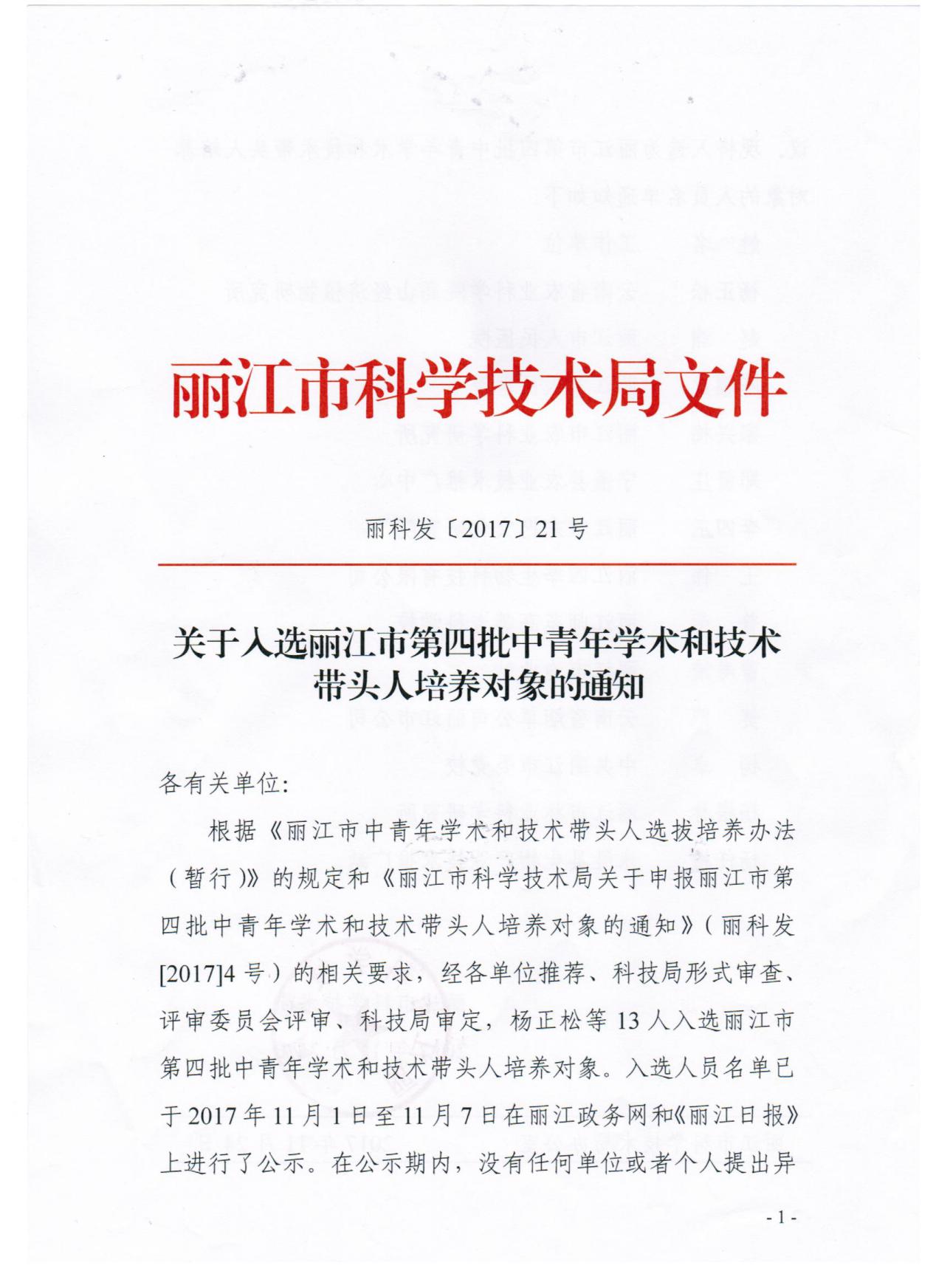 近日,收到丽江市科技局《关于入选丽江市第四批中青年学术和技术带头人培养对象的通知》丽科发[2017]21号文件,我校国际旅游与工商管理学院普荣老师入选丽江市第四批中青年学术和技术带头人培养对象,丽江全市共13人入选。