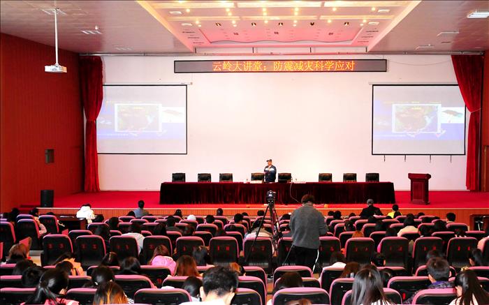 12月8日下午, 云岭大讲堂暨丽江师专第十八届学术讲坛系列讲座顺利开讲。云南省地震局李道贵高级工程师作为主讲嘉宾,为我校师生带来了题为“防震减灾、科学应对”的精彩讲座。讲座于下午两点半在我校图书馆报告厅举行,全校师生代表约500人参加了讲座。