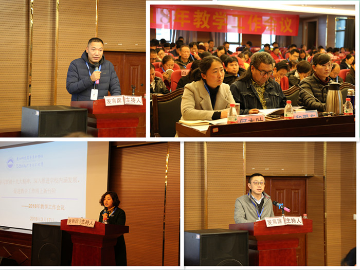 为深入贯彻十九大精神,落实学校《转型发展实施意见》《转型发展实施方案》等文件精神,总结自2015年启动学校转型发展以来的教学工作,持续深入推进学校内涵建设,我校于2018年3月17在实训楼318召开了以“学习贯彻十九大精神,深入推进学校内涵发展,促进教学工作再上新台阶”为主题的教学工作会议。学校领导、各部门负责人、学术委员会、督学以及各学院(部)院长(主任)、书记、副院长(副主任)、教学科长、各专业负责人、各专业教研室主任、转型发展论文获奖教师等140人参加了会议。
