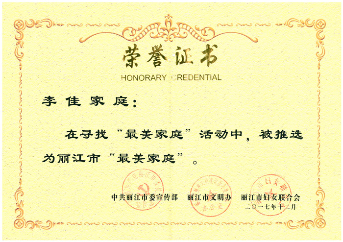 我校女职工李佳家庭因家庭和谐、团结互爱、积极向上的良好家风荣获“2017年丽江市最美家庭”称号。