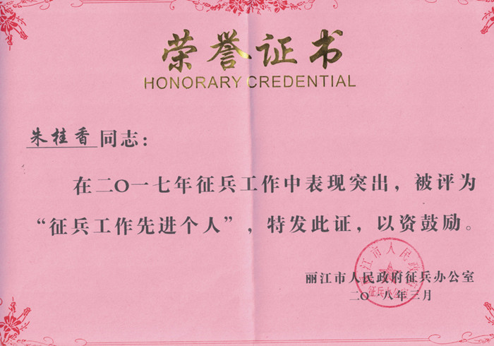 2018年4月2日下午,我校武装部部长沈欢老师代表学校参加丽江市人民政府征兵办《关于召开丽江市征兵领导小组会议和2017年征兵工作总结暨2018年征兵准备任务部署会议》,在2017年度征兵工作中,我校荣获基层武装部建设“先进单位”的称号,朱桂香副校长荣获丽江市人民政府征兵办“2017年度征兵工作先进个人”。