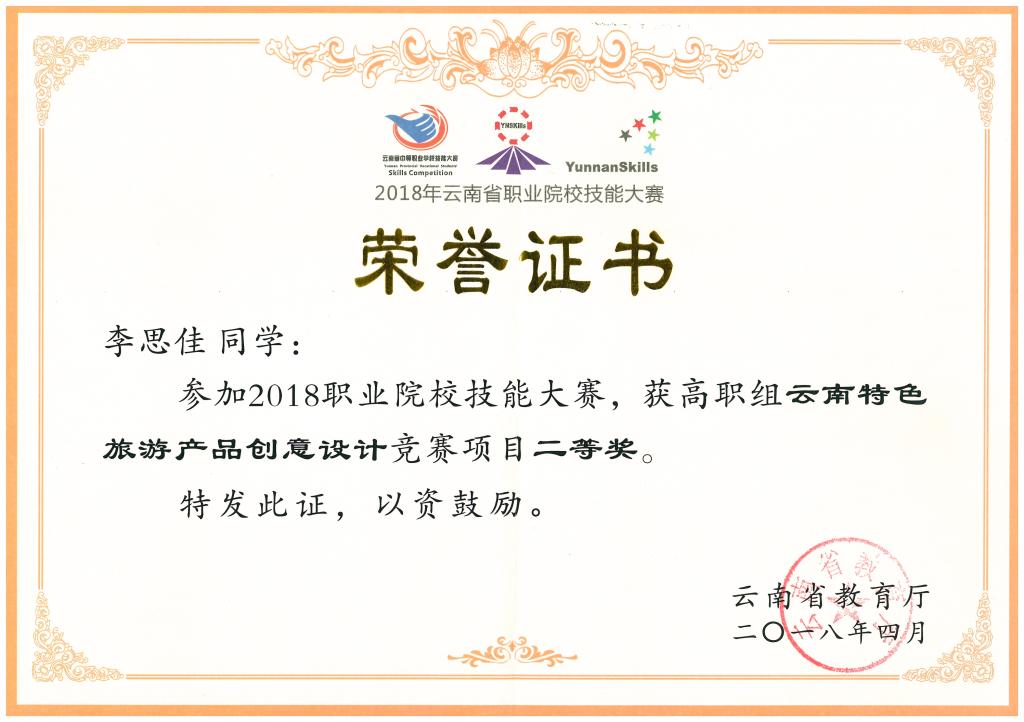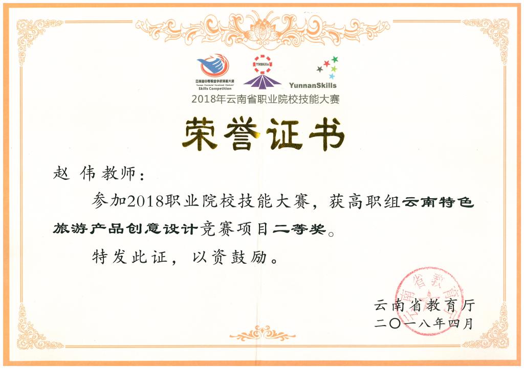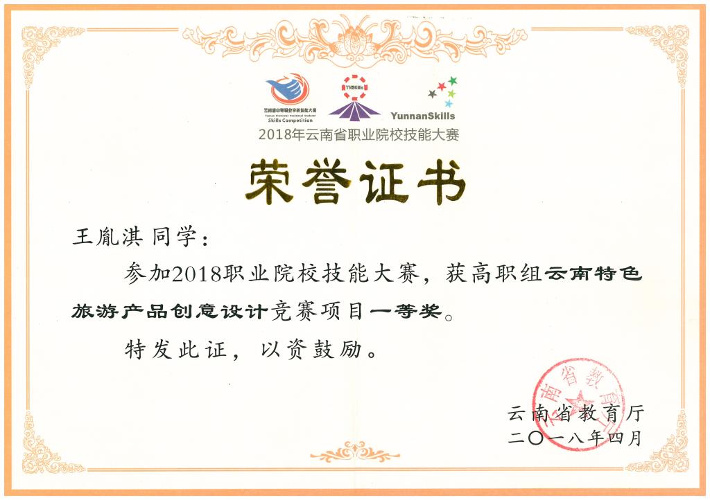 赵伟老师指导的王胤淇同学在“云南特色旅游产品创意设计”赛项中获一等奖(云南省第一名)、牛勰熬、李思佳同学均获得二等奖;和必昌老师指导的胡直姗在“艺术专业技能——原创插画设计”赛项中获三等奖;赵伟老师分别获得云南省职业技能大赛指导教师一等奖、指导教师二等奖、指导教师二等奖;和必昌老师获得云南省职业技能大赛指导教师三等奖。