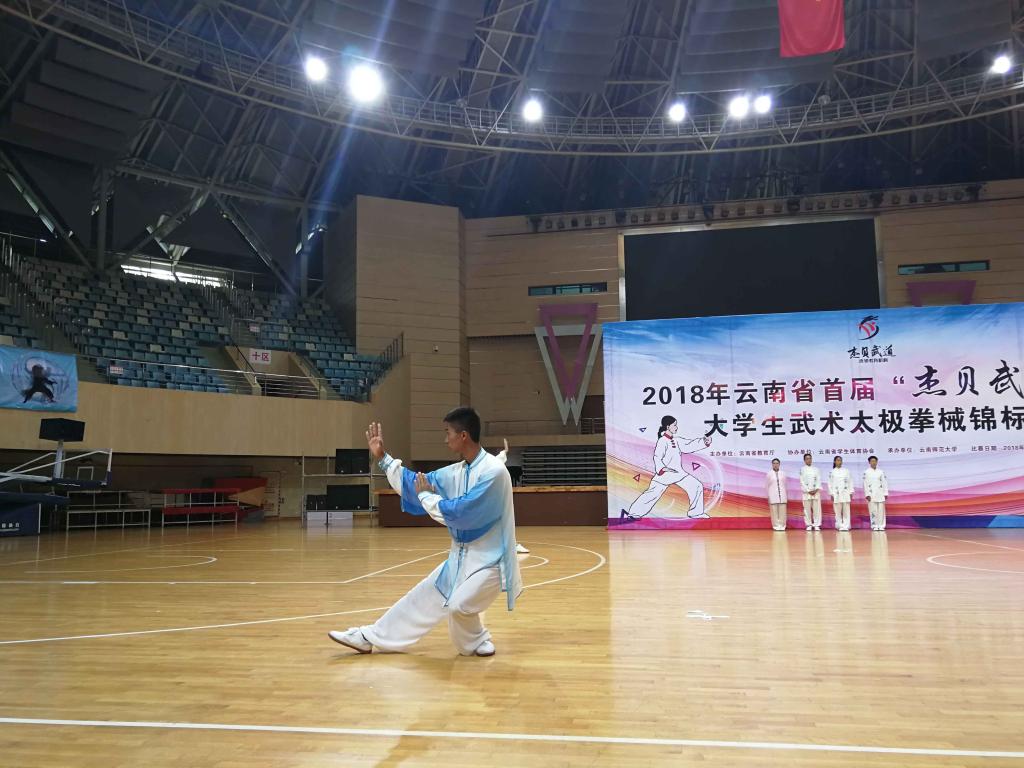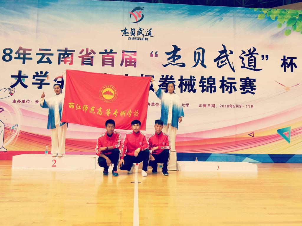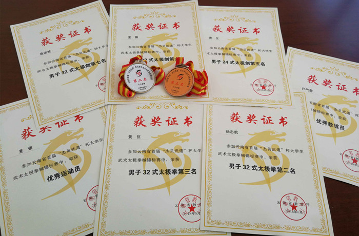 2018年5月10--11日,云南省首届高校武术太极拳、械锦标赛云南师范大学举办。该赛事由云南省教育厅主办,云南省学生体育协会承办,来自省内多个院校18支代表队,近300名运动员,分别在太极拳、器械和集体三个大项上展开了激烈的角逐。我校许俊菊老师组织学生训练,带队参加了本次比赛,我校作为唯一一所专科学校参加,参赛学生分别获得了32式太极拳银牌(第二名)、32式太极拳铜牌(第三名)、24式太极剑第五名、32式太极剑第六名和第七名,夏强同学荣获“优秀运动员”证书。