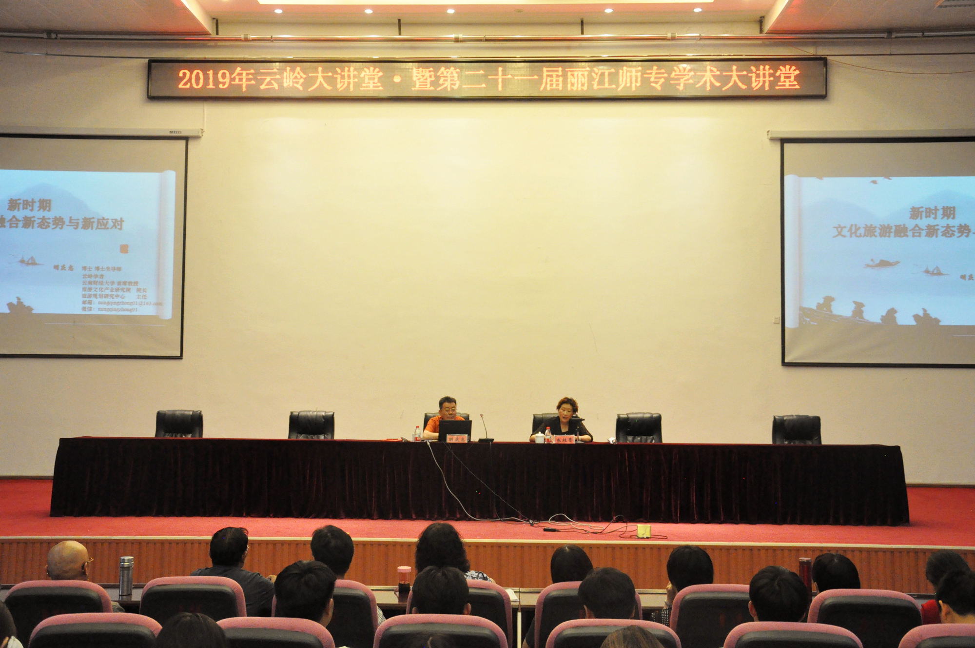 5月29日晚上,“2019年度云岭大讲堂·暨第二十届丽江师范高等专科学校学术讲坛”在我校图书馆报告厅举行。云南财经大学产业研究院院长、博士生导师明庆忠教授作了题为“新时期文化旅游融合新态势与新应对”的专题讲座,国际旅游与工商管理学院500余名师生聆听了讲座。讲座由学校朱桂香副校长主持。