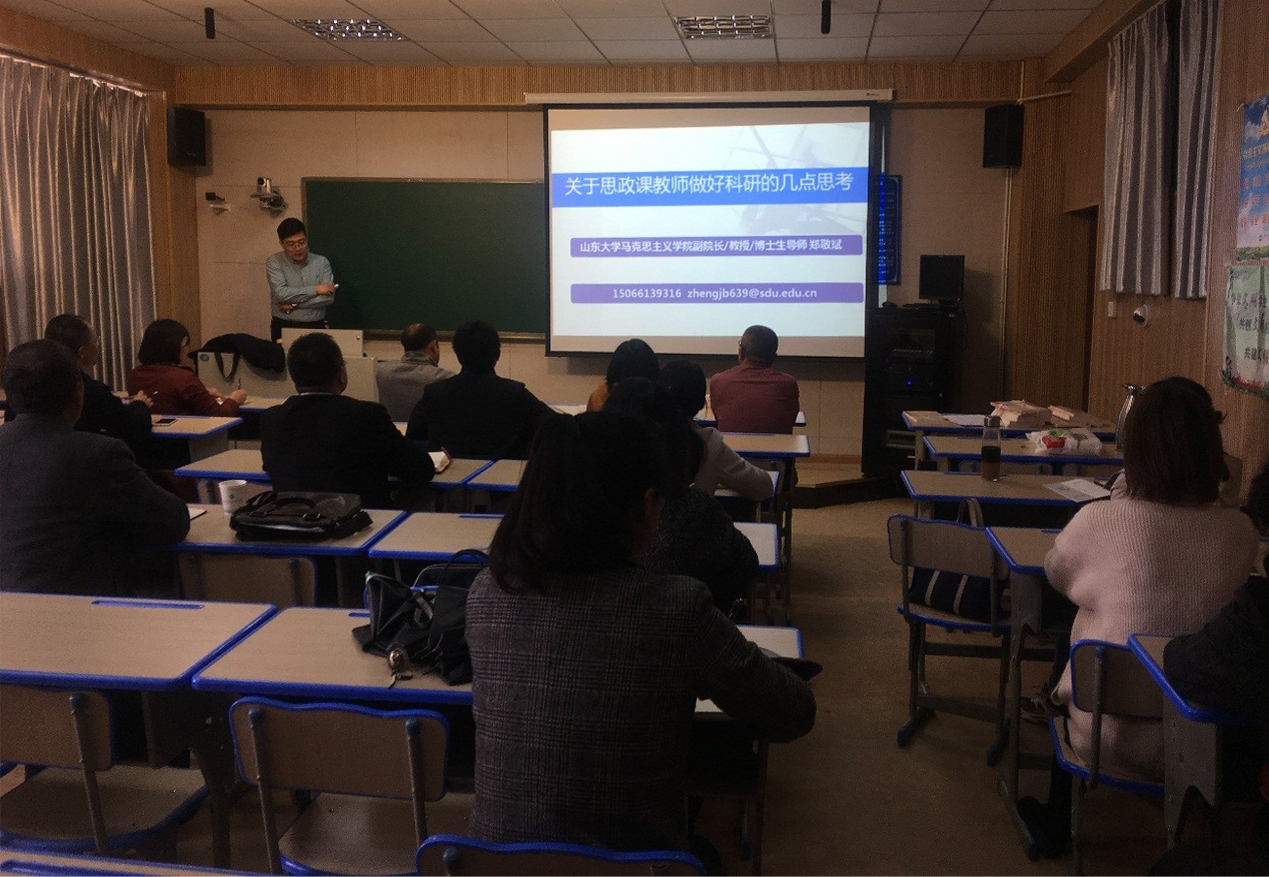 2019年11月14日下午,郑敬斌教授在教学楼308室作了题为《关于思想政治理论课教师做好科研的几点思考》的讲座,校党委书记张祖武、马克思主义学院全体专兼职教师参加。郑教授围绕“何为科研、为何科研、科研何为”三大部分的内容进行了详细的阐述和交流,对我校思想政治理论课教师的科研具有很强的现实指导意义。聆听此次讲座的教师表示,此次讲座的针对性很强,收获非常大,对自己的科研发展有很大的帮助!