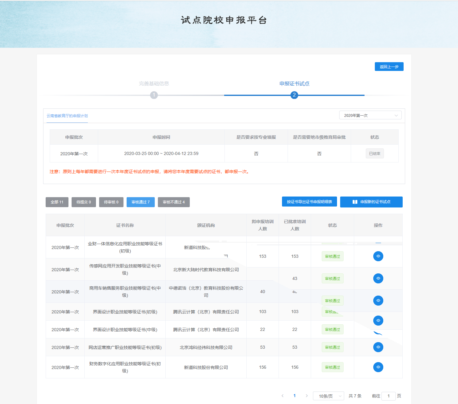 经云南省教育厅审核,我校申报的业财一体信息化应用职业技能等级证书(初级)、传感网应用开发职业技能等级证书(中级)、商用车销售服务职业技能等级证书(中级)、界面设计职业技能等级证书(初级)、界面设计职业技能等级证书(中级)、网店运营推广职业技能等级证书(初级)和财务数字化应用职业技能等级证书(初级)等6种证书全部通过。