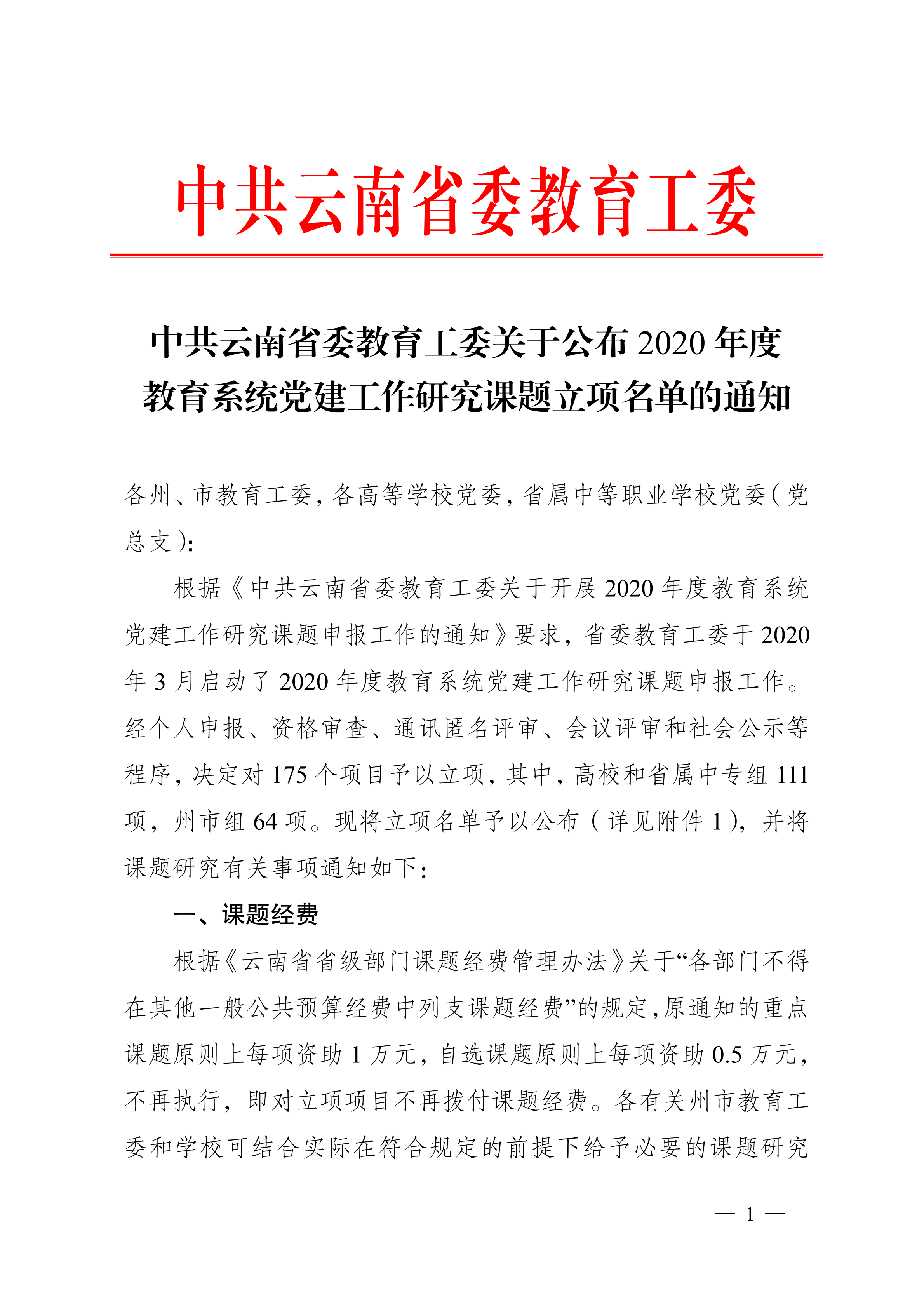 5月27日,学校收到《中共云南省委教育工委关于公布 2020 年度教育系统党建工作研究课题立项名单的通知》,我校3个项目获批立项。