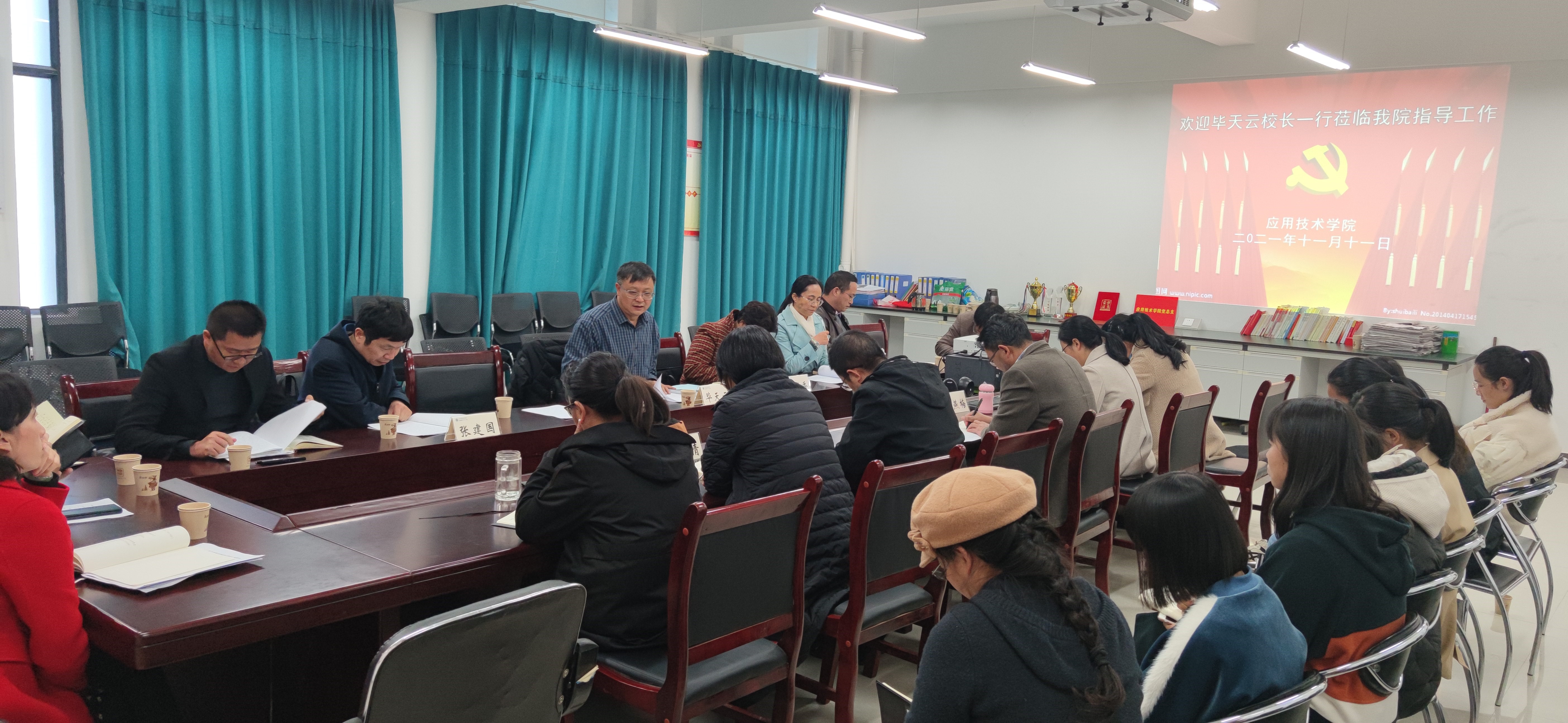 2021年11月11日下午,学校党委副书记、校长毕天云到应用技术学院指导调研,党委委员、副校长朱桂香,张建国(挂职干部)及学校办公室、人事处、教务处、财务处、科技处、学生处、教学质量监控与评估中心、就业服务中心负责人陪同调研。调研会在应用技术学院北实验楼305会议室举行,应用技术学院领导班子成员、三办主任、教研室主任及专业负责人参加调研。
