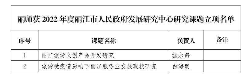 近日,经丽江市人民政府发展研究中心公示《丽江市人民政府发展研究中心2022年研究课题实施单位公示》,公示期结束,最终丽师获2022年度丽江市人民政府发展研究中心研究课题立项2项(具体信息见下表)。