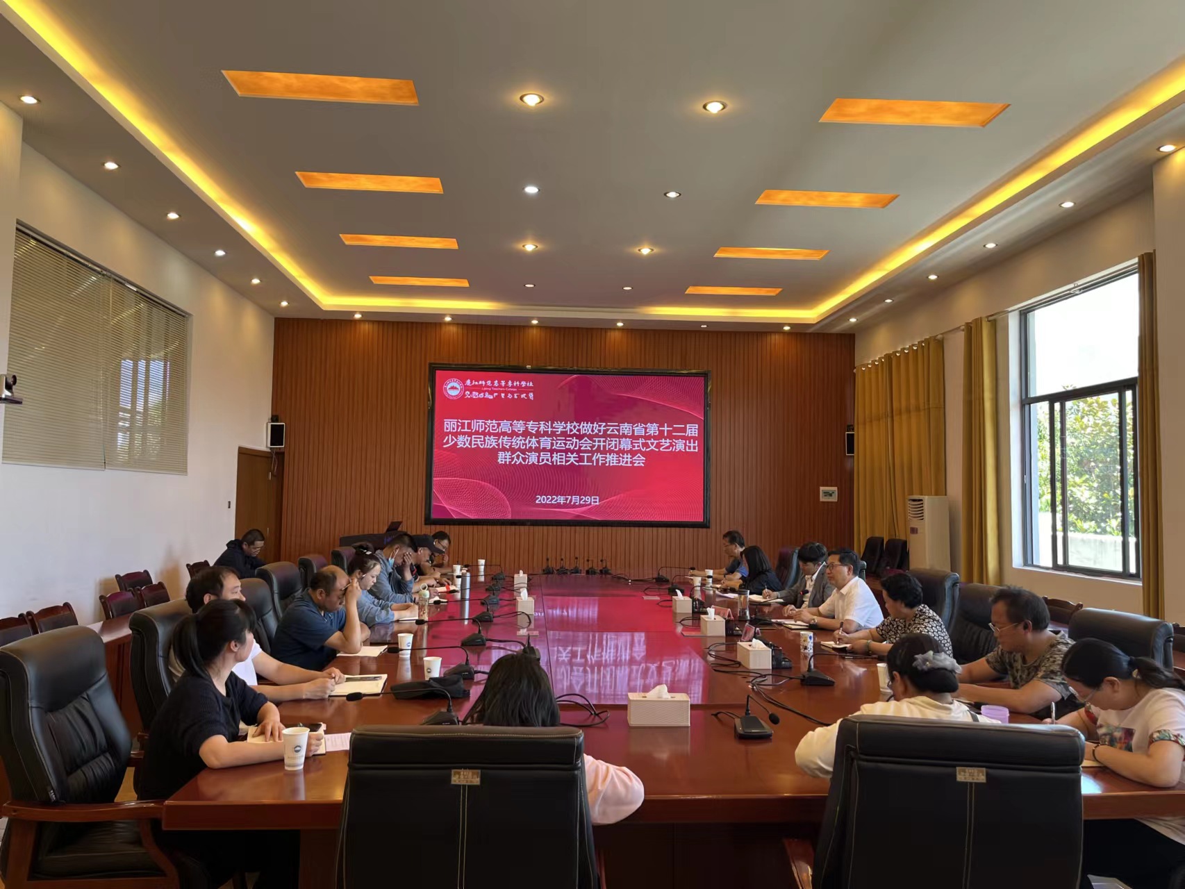为全面做好云南省第十二届少数民族传统体育运动会开闭幕式文艺演出群众演员相关工作,7月29日下午,丽师召开了工作推进会。会议由校党委副书记彭鸿昌主持,副校长朱桂香,宣传部、统战部、学生处、后勤服务中心等10个相关职能部门的负责人,各学院负责人参加了会议。
