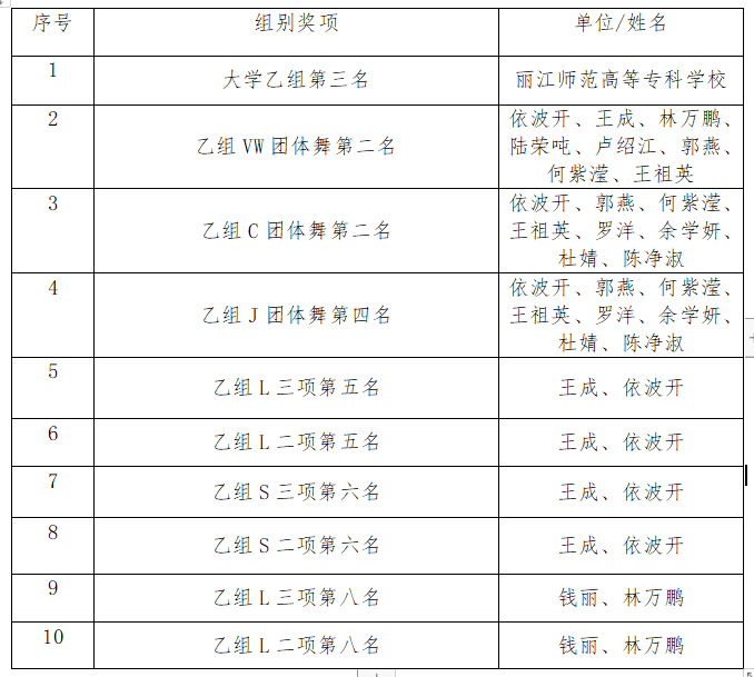 我校体育与健康学院组织参赛的体育舞蹈代表队16名运动员参加了7个项目的比赛,荣获第二名2项,第四名1项,第五名2项,第六名2项,第八名2项的好成绩,并荣获大学组体育舞蹈比赛团体总分乙组第三名。