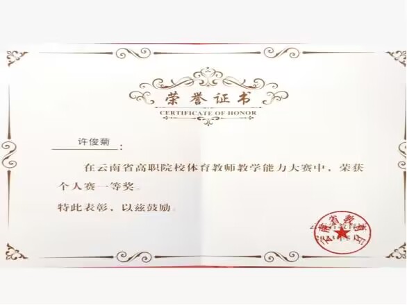 5月18-21日,云南省教育厅主办的2022年云南省高职院校体育教师教学能力大赛在昆明举行,我校体育与健康学院教师许俊菊参加个人比赛项目。经过激烈角逐,许俊菊老师在此次大赛中荣获个人赛一等奖。