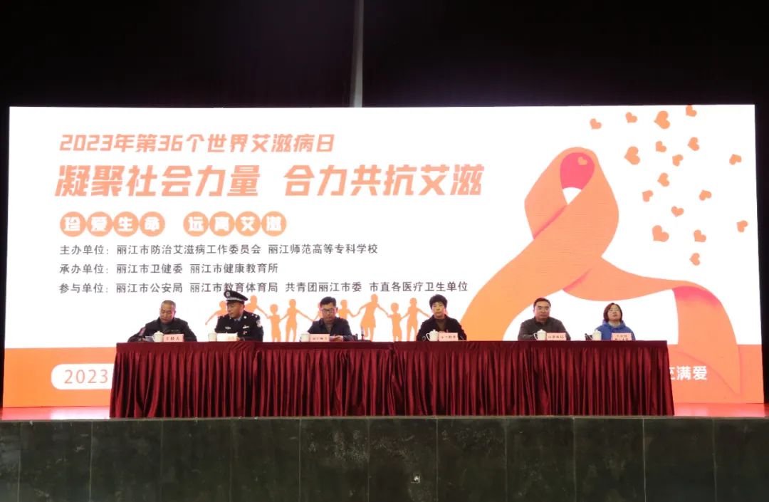 12月1日下午,由丽江市防治艾滋病工作委员会和丽江师范高等专科学校主办,丽江市卫健委、丽江市健康教育所承办的2023年第36个世界艾滋病日宣传活动在我校体育馆举行。市卫生健康党工委专职副书记、副主任、市防艾局局长李润清,市公安局禁毒支队陈志斌,市教育体育局李丽军,我校党委副书记彭鸿昌出席活动。活动由丽江市健康教育所负责人王锦主持。