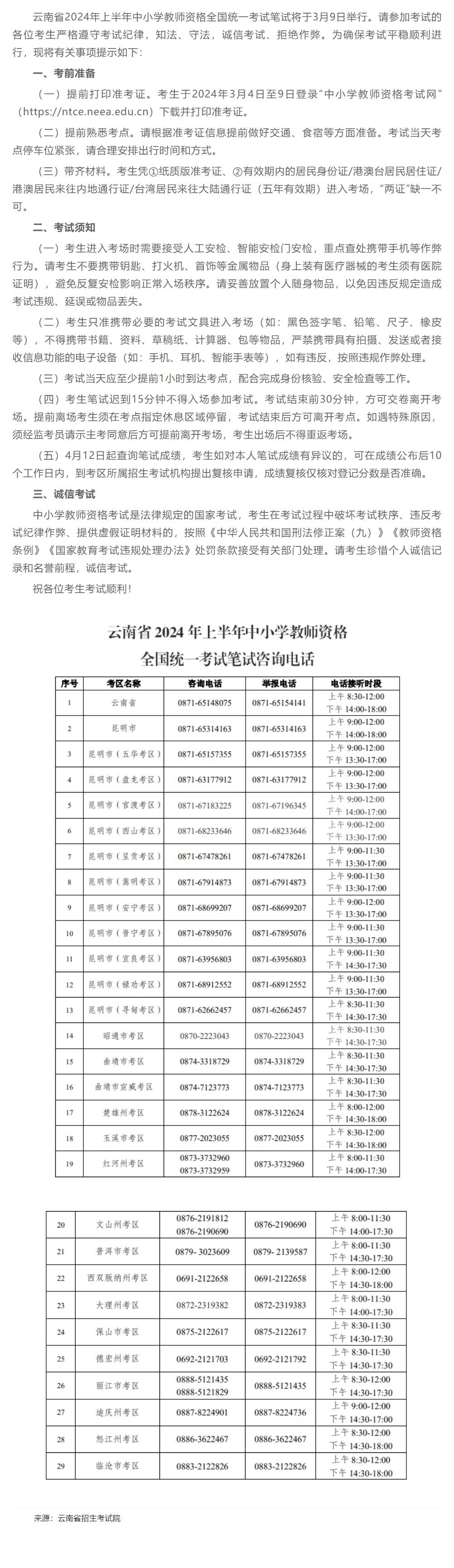 云南省2024年上半年中小学教师资格全国统一考试笔试温馨提示