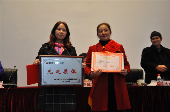 和克纯副校长宣读旅经系获得2016年云南省教育系统先进集体、周文英老师获得云南省优秀教师的文件,宣读我校2016年年度考核结果的文件,主席台就座的领导为他们颁发奖牌。