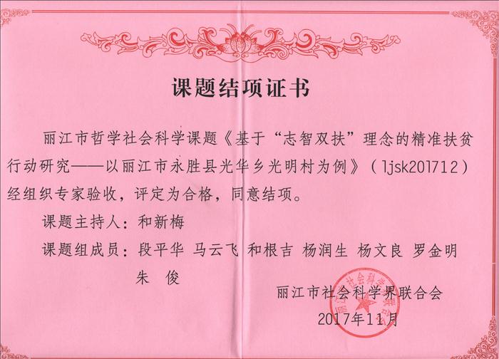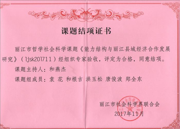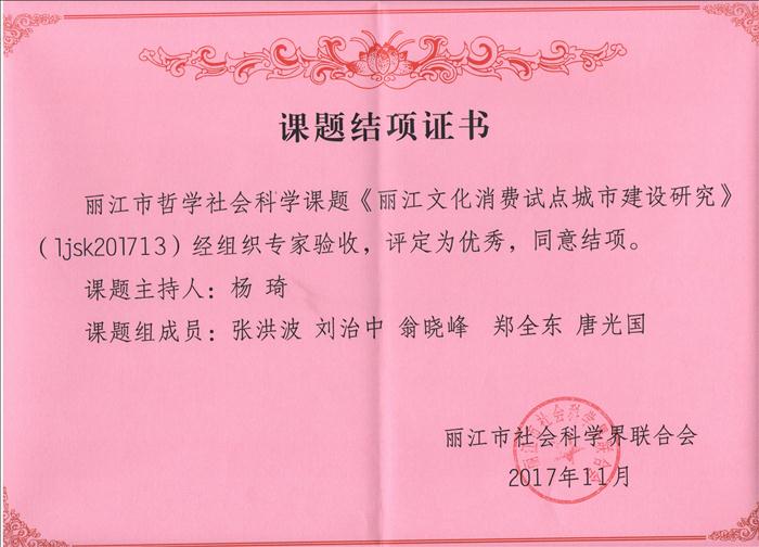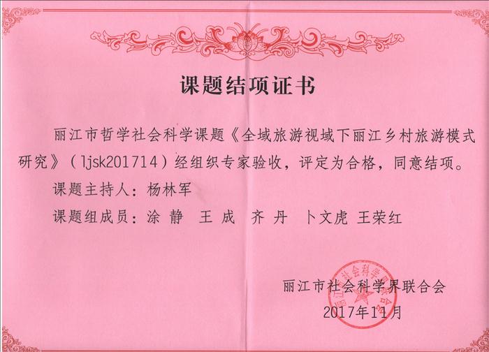 近日,我校4个项目获2017年度丽江市哲学社会科学课题立项,经过近半年的项目研究,杨琦博士主持的项目《丽江文化消费试点城市建设研究(ljsk201713)》,验收评定等级:优秀;杨林军博士主持的《全域旅游视域下丽江乡村旅游模式研究(ljsk201714)》,验收评定等级:合格;和燕杰副教授主持的《能力结构与丽江县域经济合作发展研究(ljsk201711)》,验收评定等级:合格;和新梅副教授主持的《基于“志智双扶”理念的精准扶贫行动研究——以丽江市永胜县光华乡光明村为例(ljsk201712)》,验收评定等级:合格,4个项目都通过了结项验收,顺利结项。