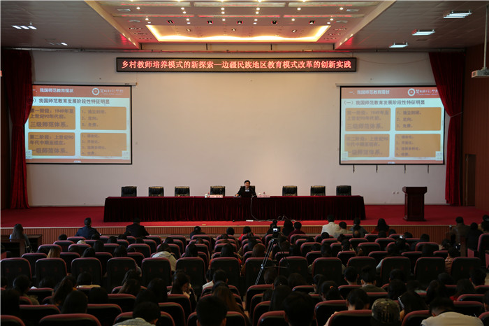 下午罗明东校长在图书馆报告厅作了题为“乡村教师培养模式体系的探索与创新——边疆民族地区教师教育模式改革的探索创新”的讲座,从“我国师范教育现状”、“边疆民族地区乡村教师需求现状”、“乡村教师培养新认识”、“乡村教师培养模式体系的探索与实践”四方面全方位分析解读了乡村教师培养模式的全新思路和改革方向。为我校师生对师范教育、乡村教师培养模式有了更深入的理解,为今后改革发展提供了新思路、新方法。张洪波校长主持座谈会,全校400余名师生代表参加了讲座。