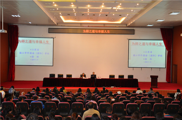11月2日下午15:00,中国青少年传统文化研究院首批国家级研究员、镇江市外国语学校副校长徐玲在我校图书馆报告厅作了题为“为师之道与幸福人生”的专题报告会,张洪波校长主持报告会,副校长朱桂香和300余名师生代表参加报告会。